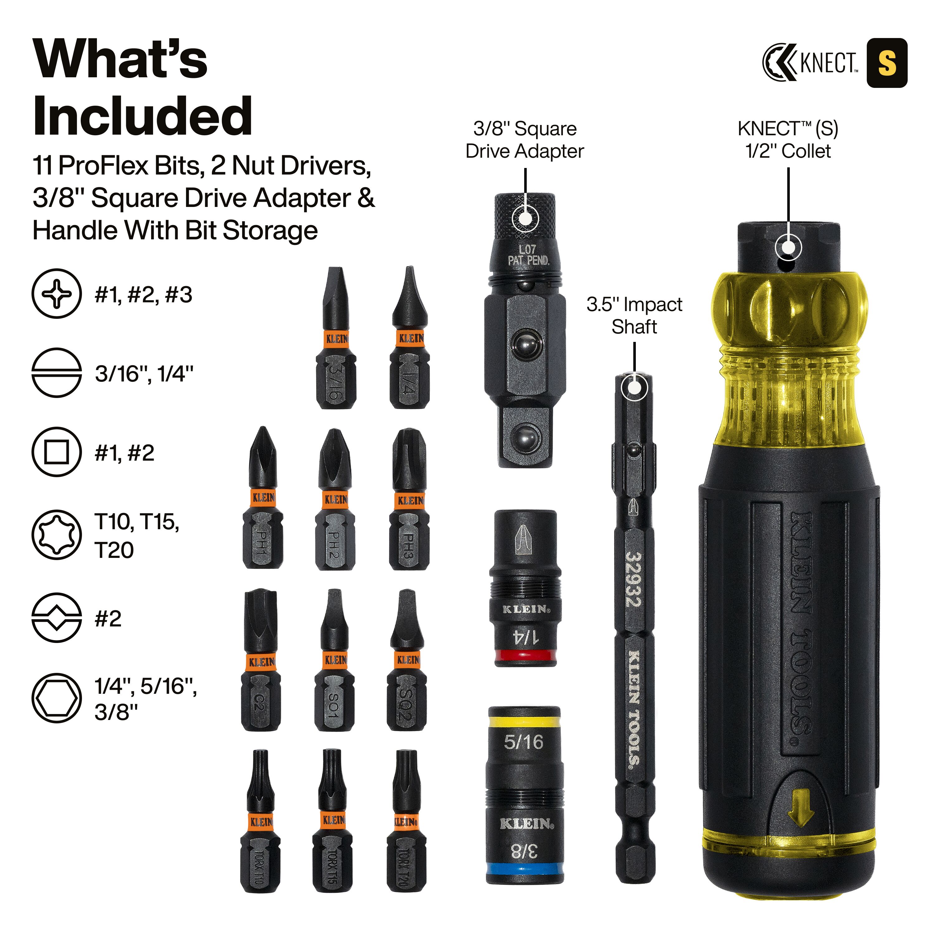 - KNECT™ (S) 1/2-Inch collet with 11 screwdriver bits, 3 socket sizes, deep 1/4-Inch bit holding and 3/8-Inch square drive adapter