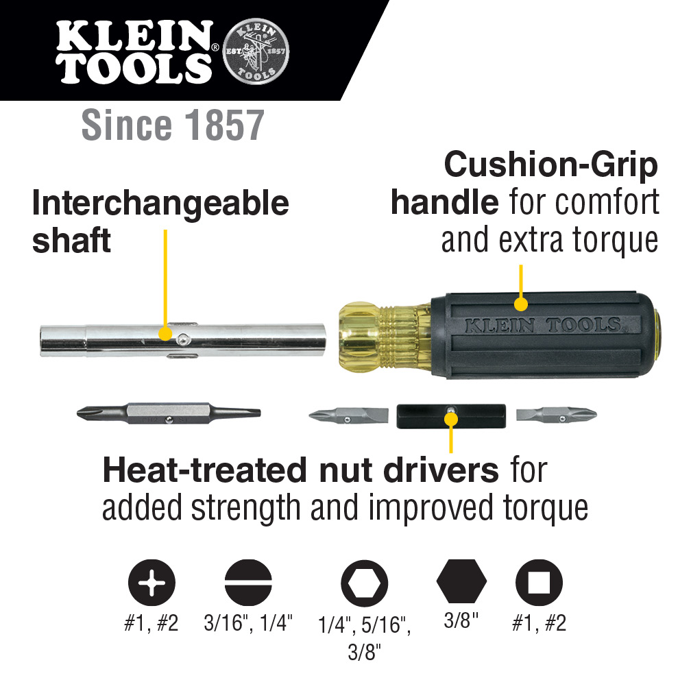 Klein Tools' Interchangeable Multi-Bit Screwdrivers / Nut Drivers are heavy-duty tools designed for professionals. They are made of the highest-quality tempered steel with a torque-proof anchor in the handle. Strong, durable tips are manufactured with square edges to fit screw openings securely. They resist slippage and provide positive turning action. Stronger nut driver function improves bit-holding power, even with tough applications.