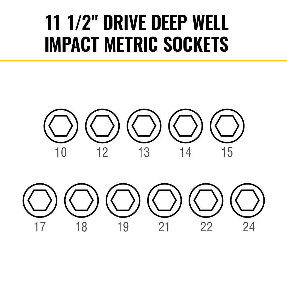 - Socket Set contains most common metric deep-well impact socket sizes up to 24 mm