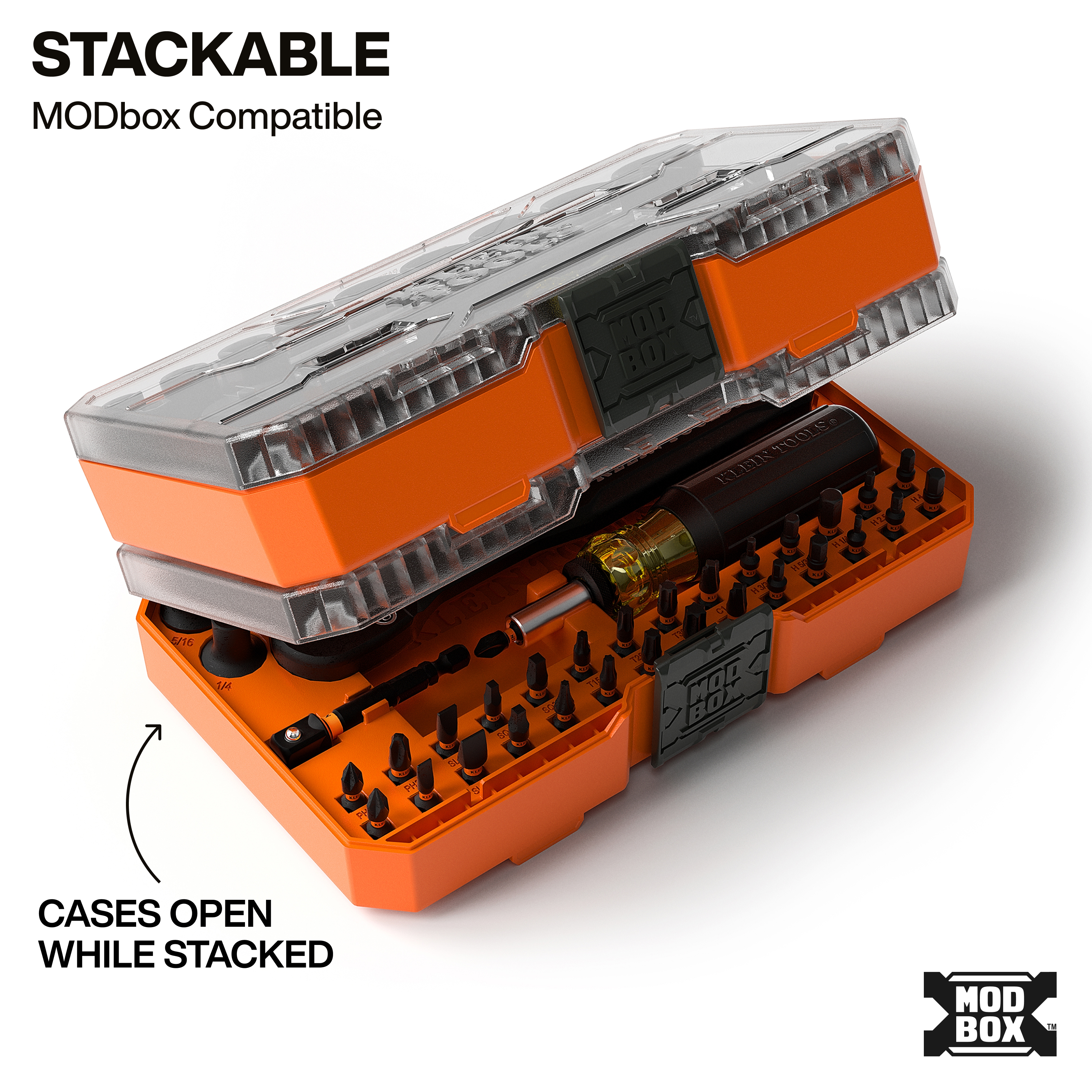 Klein Tools designed a premium Bit Set for the professional tradesman and DIY enthusiasts. This screwdriver includes a magnet for secure bit retention and the socket wrench ensures maximum torque. The bits are made of high-impact rated S2 steel with an optimized torsion zone to enhance durability by absorbing impact forces. All pieces fit in an impact-resistant case featuring steel hinges and a stay-shut latch with modular stack-ability with cases of similar design and is MODbox™ compatible.