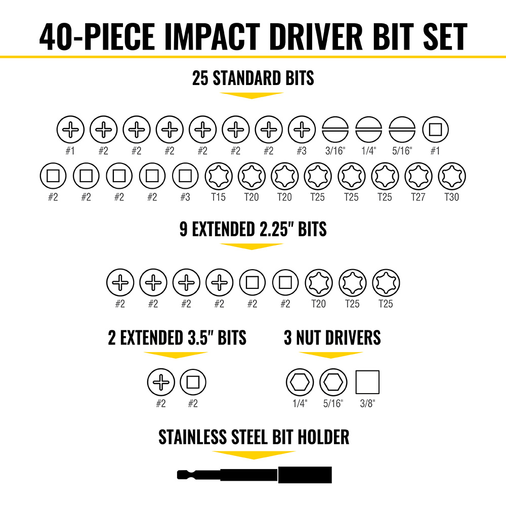 - Variety of Phillips, Slotted, Square and TORX® bits to drive the most common fasteners on the job
