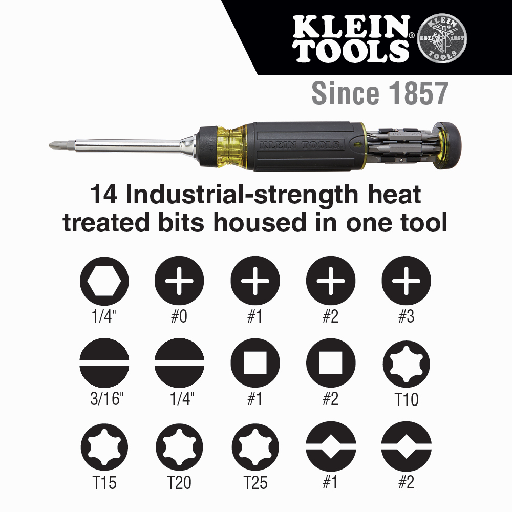 Klein Tools' Multi-Bit Screwdrivers help make your job a little easier. The 15-in-1 Ratcheting Screwdriver's durable ratcheting mechanism allows for faster and easier all-day driving. With the on-board storage of 14 common bits and a 1/4-Inch nut driver, this is your new everyday screwdriver. This screwdriver features industrial-strength bits as well as Cushion-Grip™ handles for outstanding comfort and control.