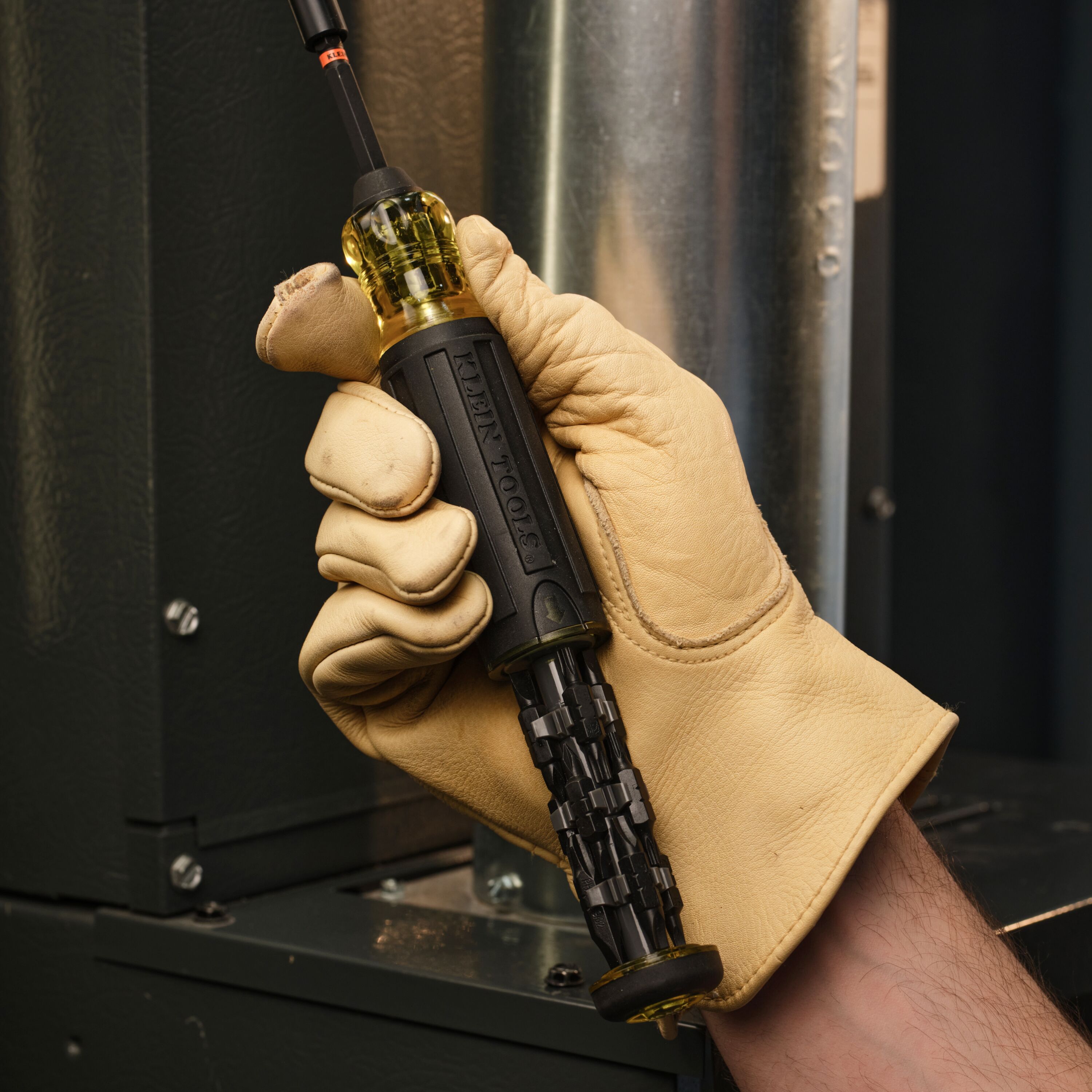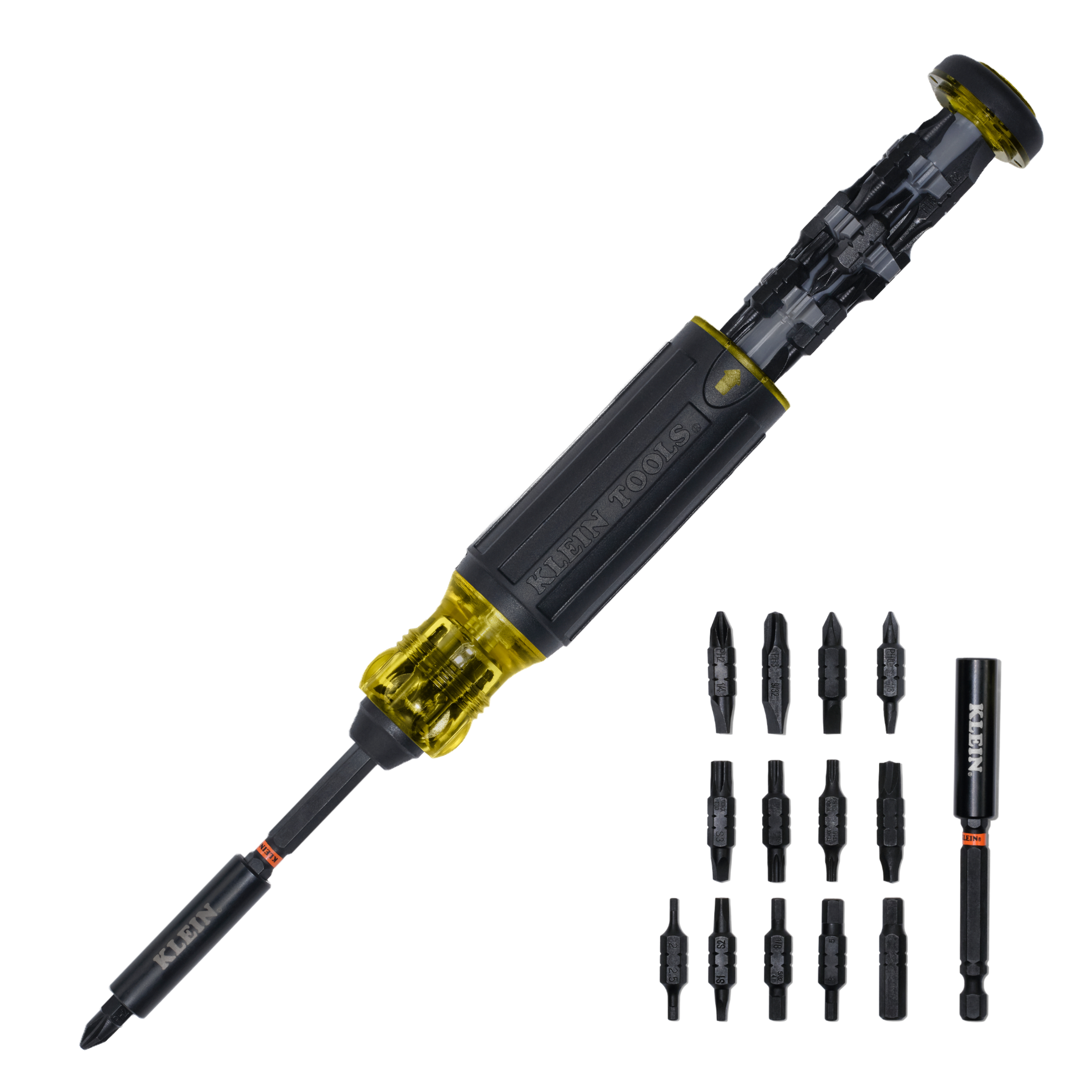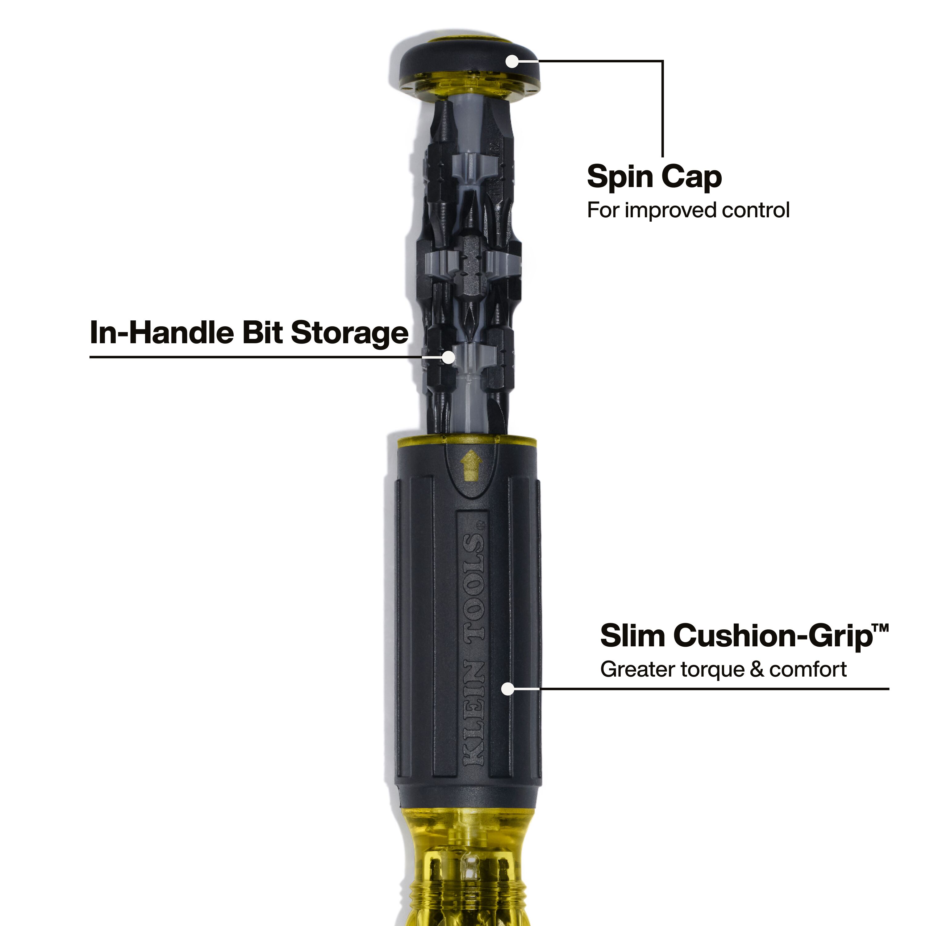 Klein Tools 27-in-1 Multi-Bit Slim Screwdriver includes 13 double-ended bits with 26 tip sizes plus a 1/4-Inch bit holder covering Phillips, Slotted, Square, TORX®, Combo, and Hex applications. Impact-rated bit holder withstands high-torque use and can be removed for attachment to an impact driver. A Rare-Earth magnet secures bits and fasteners, while in-handle storage keeps bits organized. Slim Cushion-Grip™ handle provides comfort and control for professional driving tasks.