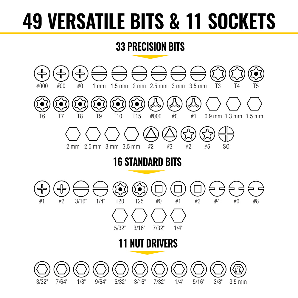 - Precision Driver Set with 33 precision bits, 16 standard bits, 11 nut drivers, bit adapter, adjustable screwdriver, and micro-ratchet inside our MODbox™ System Case for multi-faceted applications