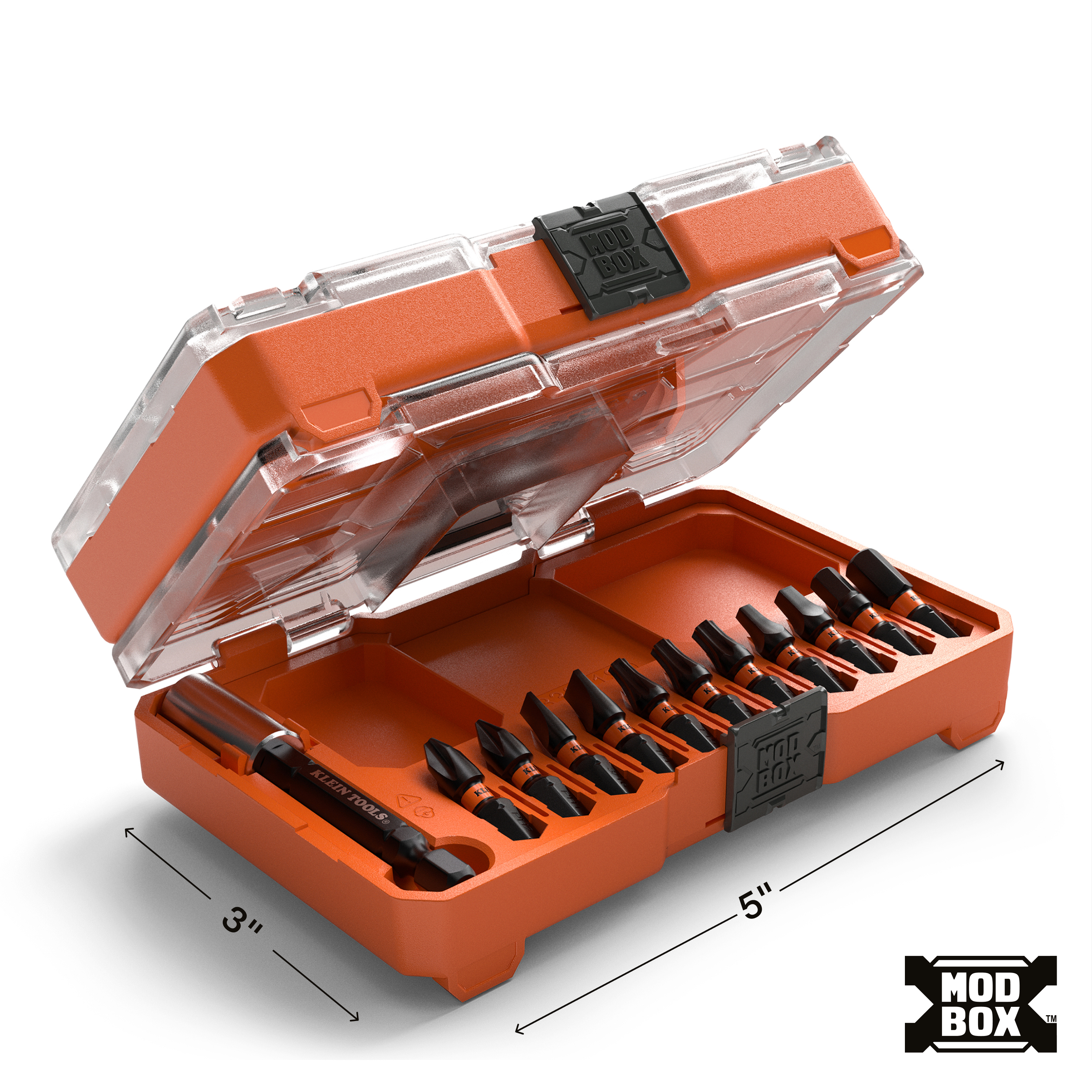 Klein Tools 12-Piece Slim Impact ProFlex Bit Set features S2 steel bits with ProFlex torsion zone that absorbs strain, extending bit life and improving impact performance. The ultra-slim case allows compact storage and has an extending back latch to connect to larger Klein Tools cases. Secure-pivot bit storage makes bit access simple while preventing bits from accidentally falling and being misplaced.
