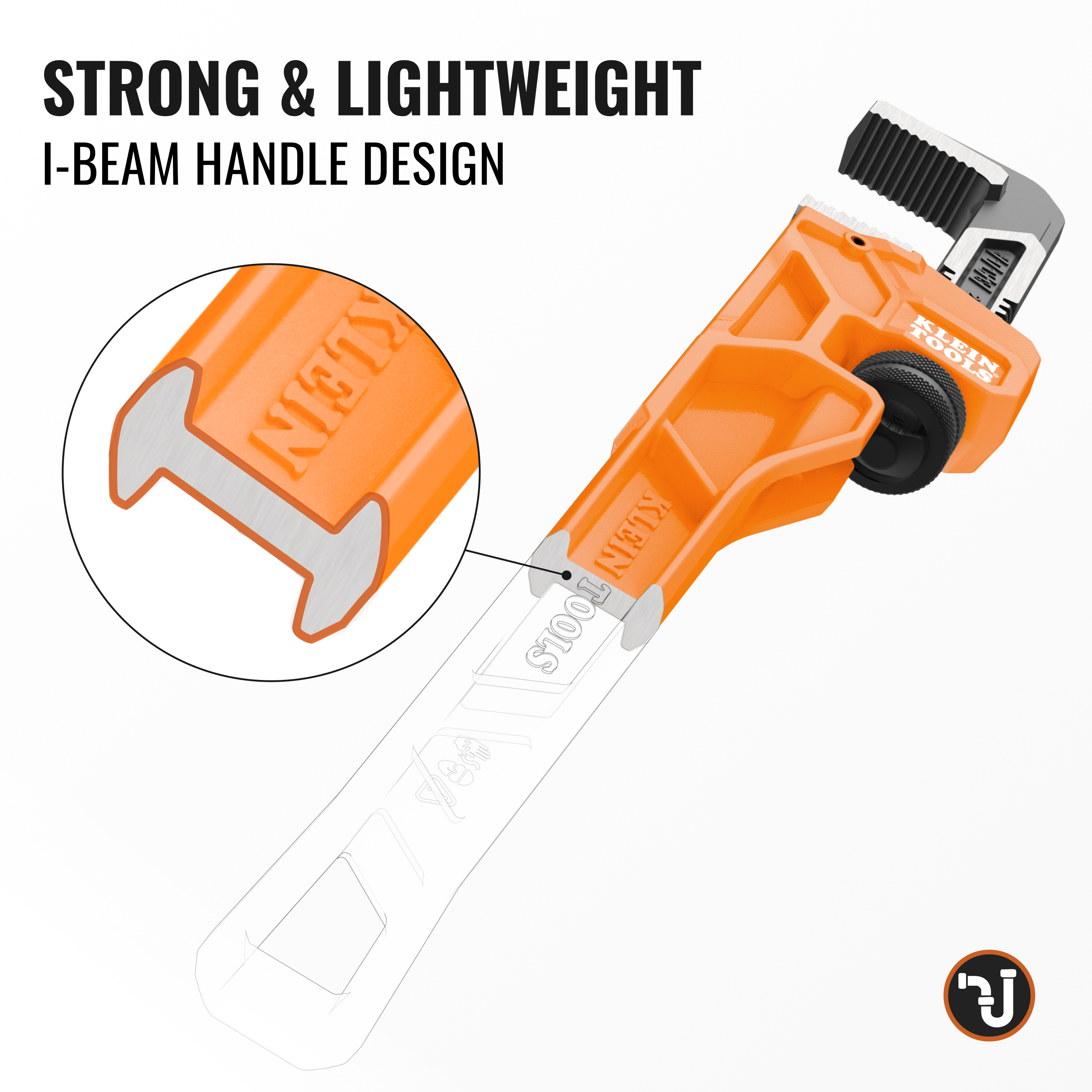The Klein Tools Cast Iron Pipe Wrench is both durable and lightweight. The 18-Inch I-beam handle design allows for heavy-duty, high-torque application. Offering a versatile gripping range, the wrench adjusts to fit up to 2-1/2-Inch pipes.