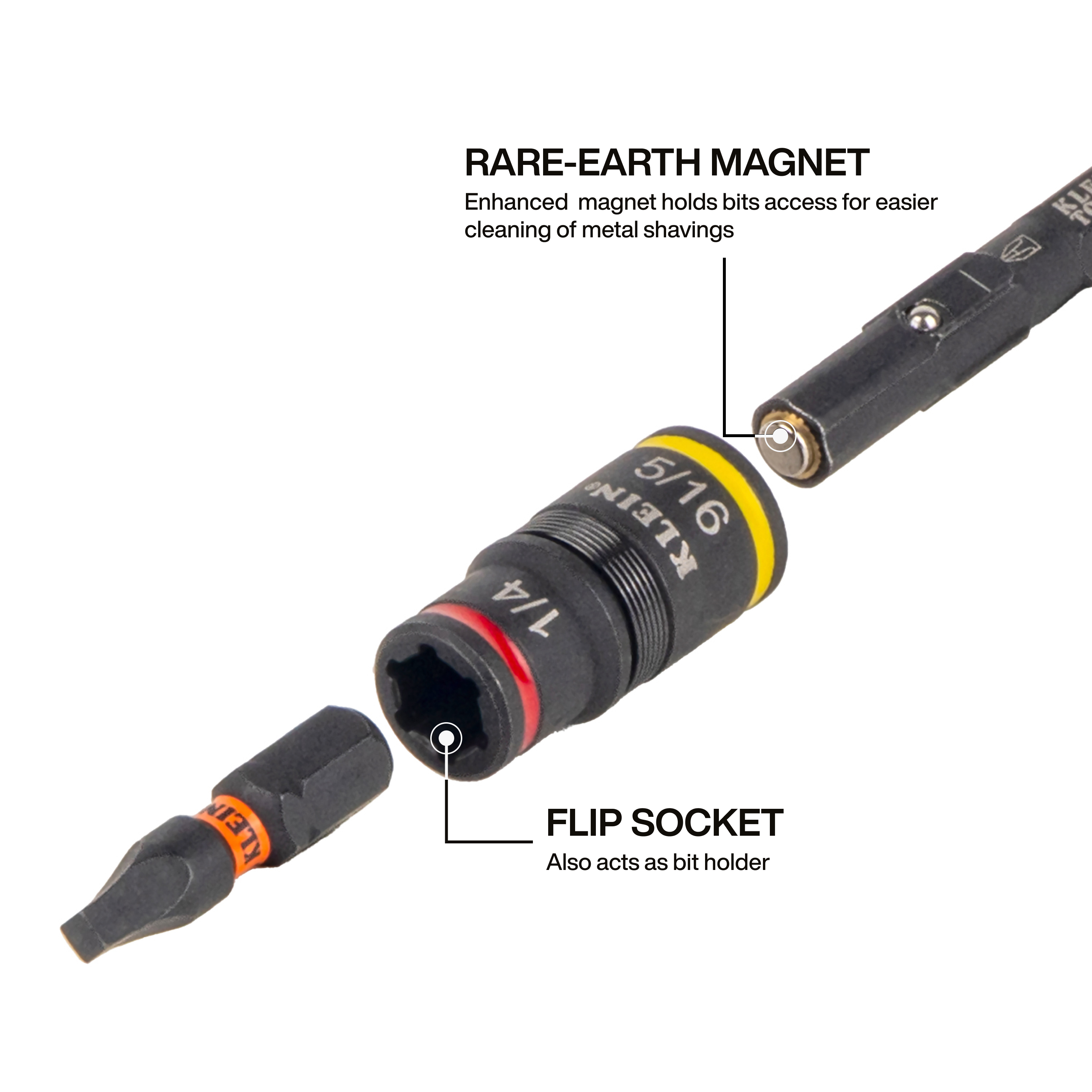 Klein Tools 85191HD Flip Socket Conduit Reamer Driver reams and smooths 1/2-inch (13mm), 3/4-inch (19mm), and 1-inch (25mm) conduit without requiring component removal. This tool features an improved leaf spring design that provides a secure grip, while the auto-lock mechanism securely connects to quick-connect handles, with a simple collar pull-back to release. The 3-in-1 flip socket functions as a magnetic bit holder, and the Cushion-Grip™ handle provides extra torque and comfort.