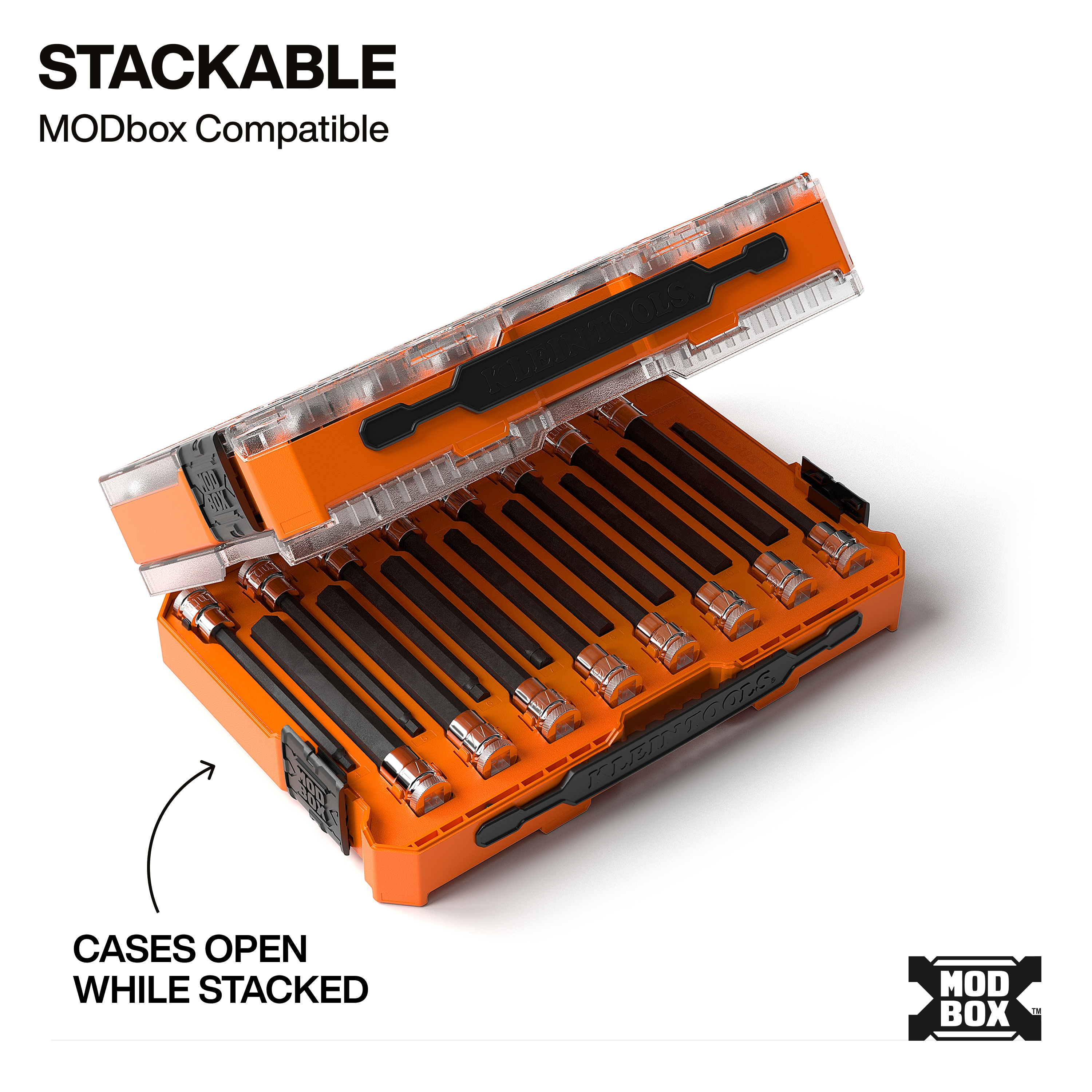 The Klein Tools 16-Piece Long Hex Bit Socket Set features SAE and metric sizes from 5/32-Inch to 1/2-Inch and 4 mm to 12 mm, with long hex bits for extra clearance in tight spaces. Knurling on the socket base ensures a strong grip for hand-starting fasteners, while bold stamped size markings allow for quick identification. The included MODbox™ accessory case is stackable and MODbox™ compatible, offering seamless storage and organization.