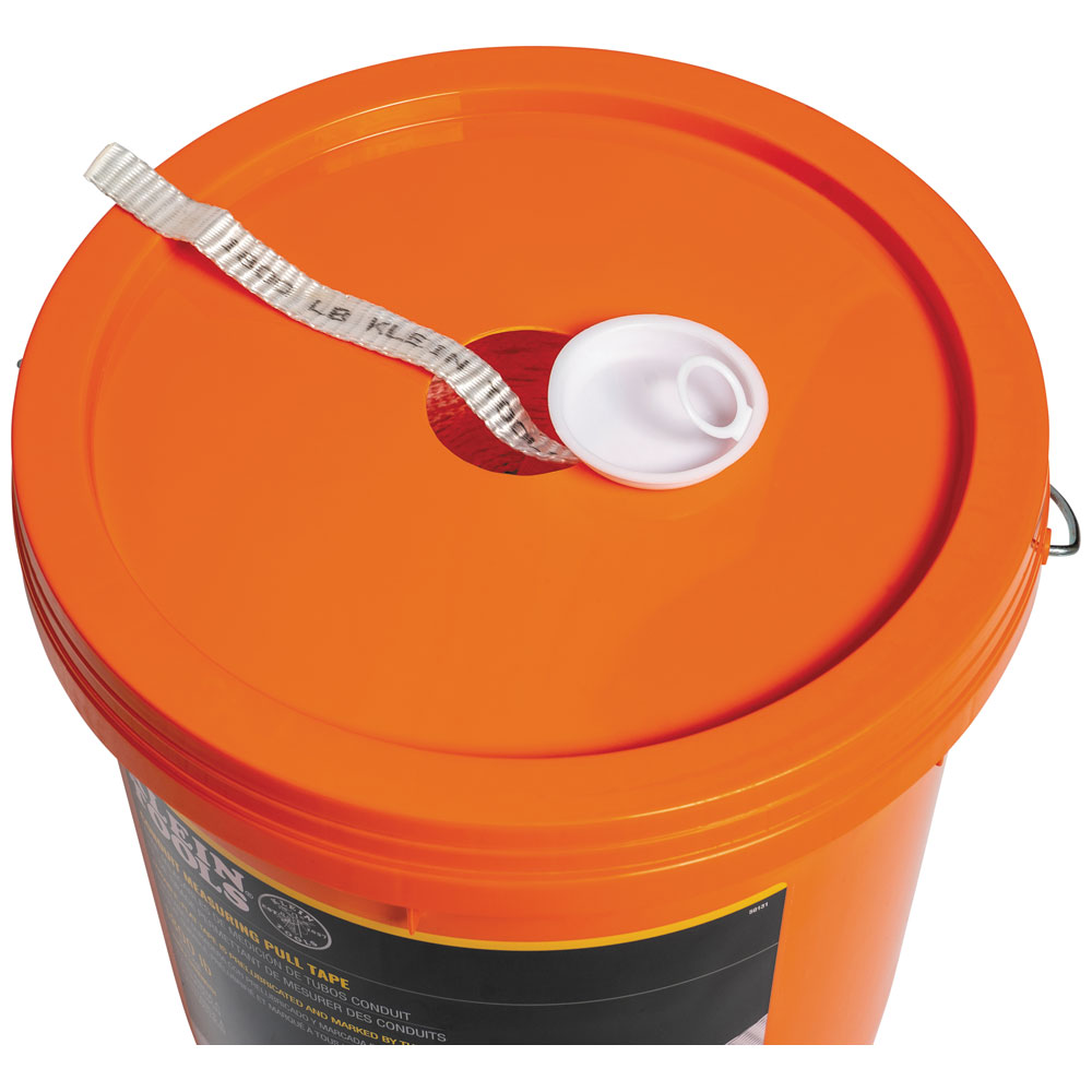 The Klein Tools 1800-Pound tensile strength conduit measuring pull tape is a durable, flat polyester strapping that disperses pull load and minimizes stretching when pulling. The tape is marked with descending 1-Foot increments to measure conduit runs. Tape is pre-lubricated to reduce friction and comes in a bucket with a hole in the lid for tangle-free dispensing. Pull Tape is Made in USA and available in a variety of tensile strengths and lengths.