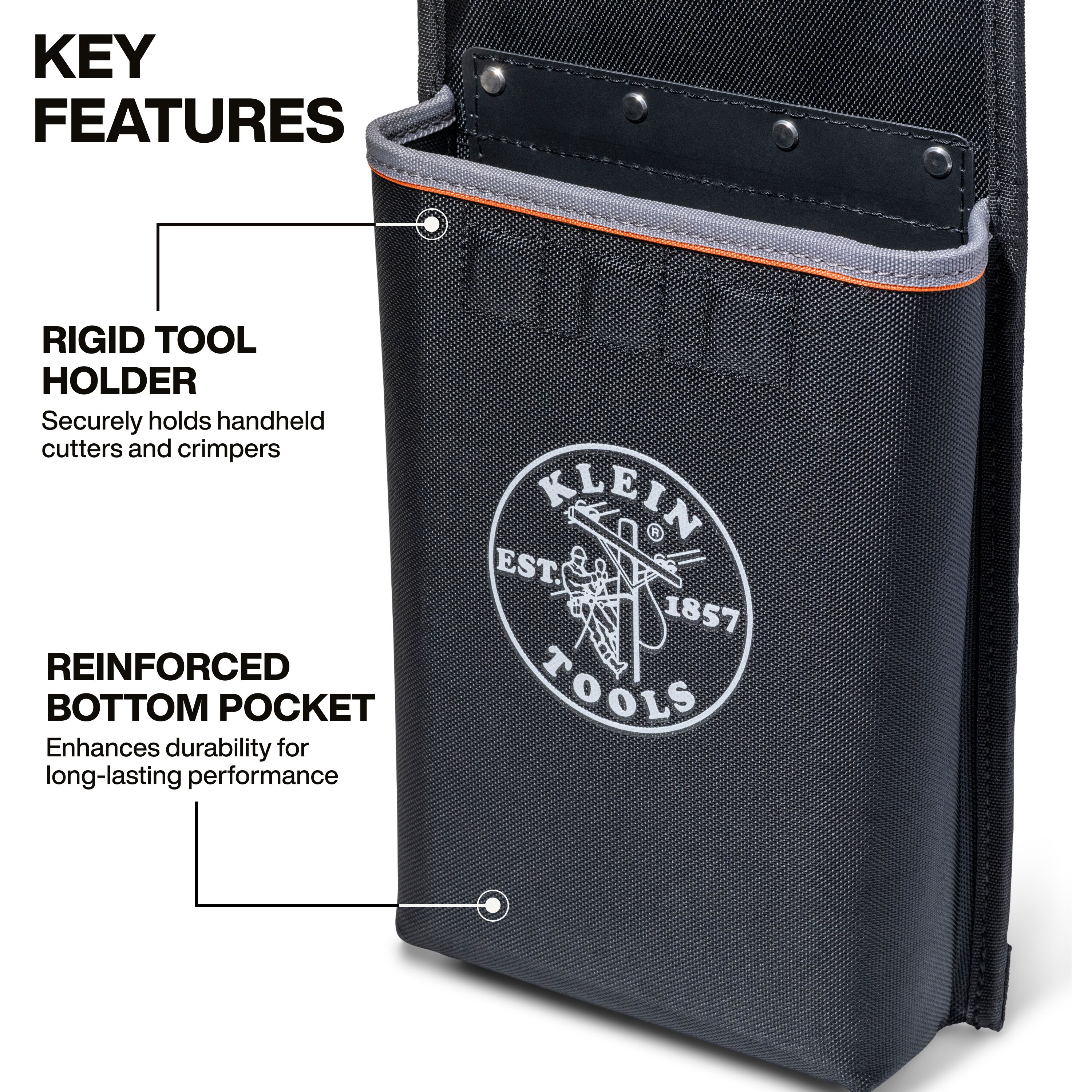 The Klein Tools Crimper Holder delivers durable protection and quick access to essential lineman tools, keeping gear jobsite-ready. Purpose-built for hand-held cutters and crimpers, it includes a magnetic weather-resistant shield, reinforced bottom pocket, and drainage holes to keep tools dry. Ruggedly built from heavy-duty materials and Bucket Work Center rail-compatible, this utility bucket accessory ensures reliability, organization, and performance for linemen in the field.