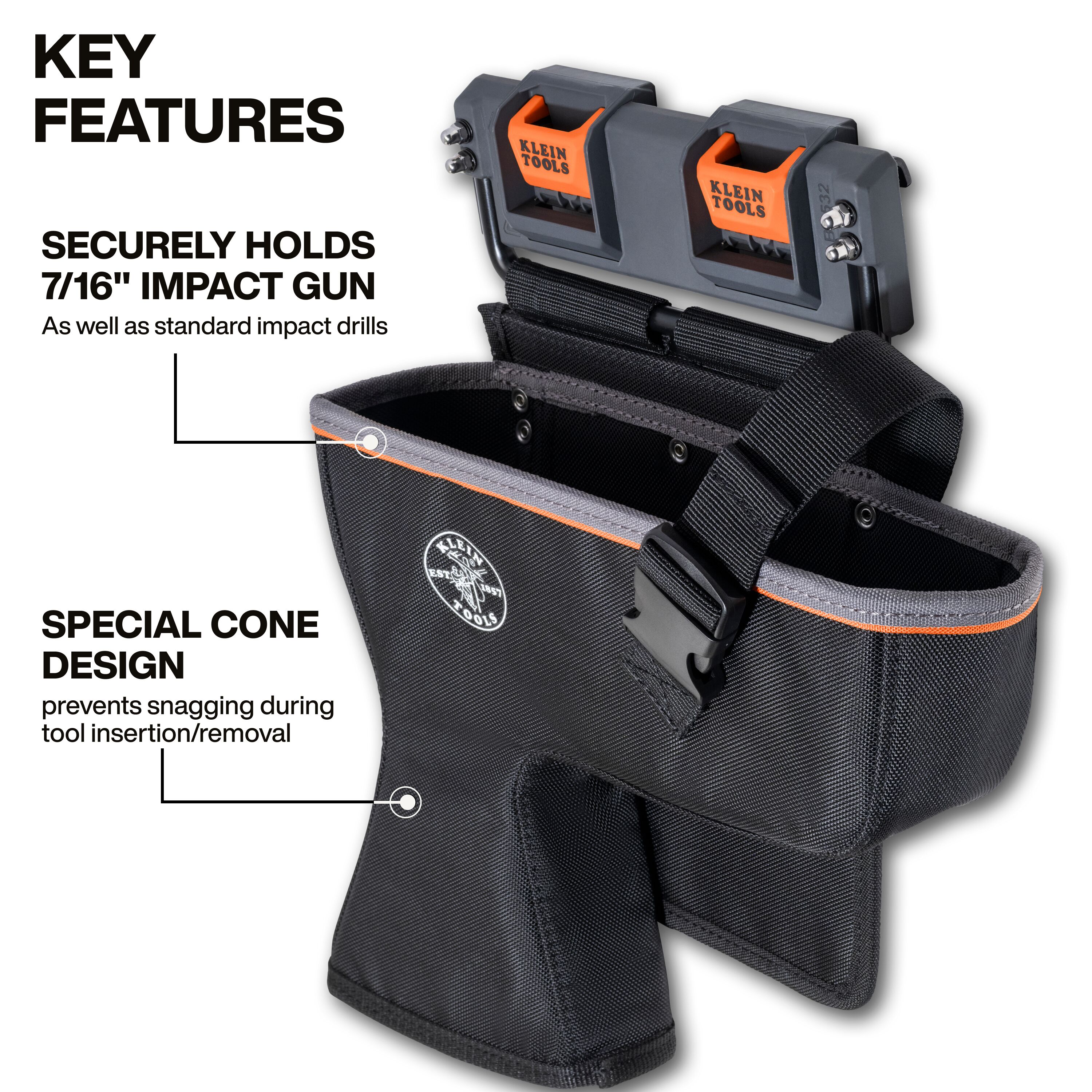 The Klein Tools Impact Holder is a heavy-duty Bucket Work Center rail system accessory that keeps 7/16-Inch impact guns and standard drills secure and jobsite-ready. Featuring a snag-free cone to prevent tool snagging, socket-on storage for added efficiency, and an integrated retention buckle for worry-free transport, this durable lineman bucket organizer delivers rugged tool storage and reliable performance for everyday utility work.
