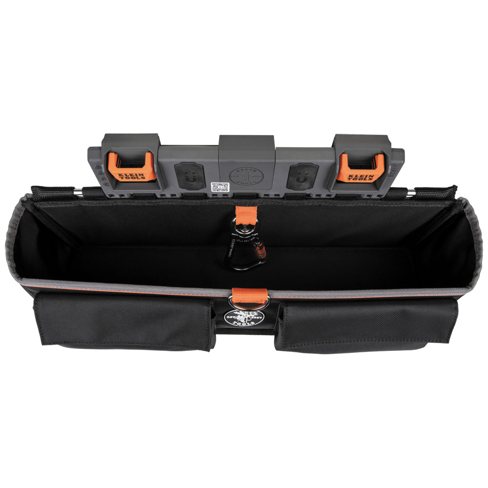 The Bucket Work Center is an ecosystem that will revamp the way a lineman works. It allows linemen to customize their workspace, just like other professionals customize their office space. This will be ''The Lineman's Office''. The Bucket Work Center easily connects to aerial buckets with a standard 2-Inch or 3-Inch (5.1 or 7.6 cm) lip. Made of impact resistant materials with dielectric properties (up to 35kV) to withstand work conditions from -25 to 125-Degree Fahrenheit (-32 to 52-Degree Celsius). An assortment of modules are available to customize each workstation to fit the tools needed for the job. The Klein Tools Large Pouch Module connects to the Bucket Work Center Rail System and can hold a wide variety of linemen tools and hardware, including battery operated cutters, crimpers, and impact wrenches.