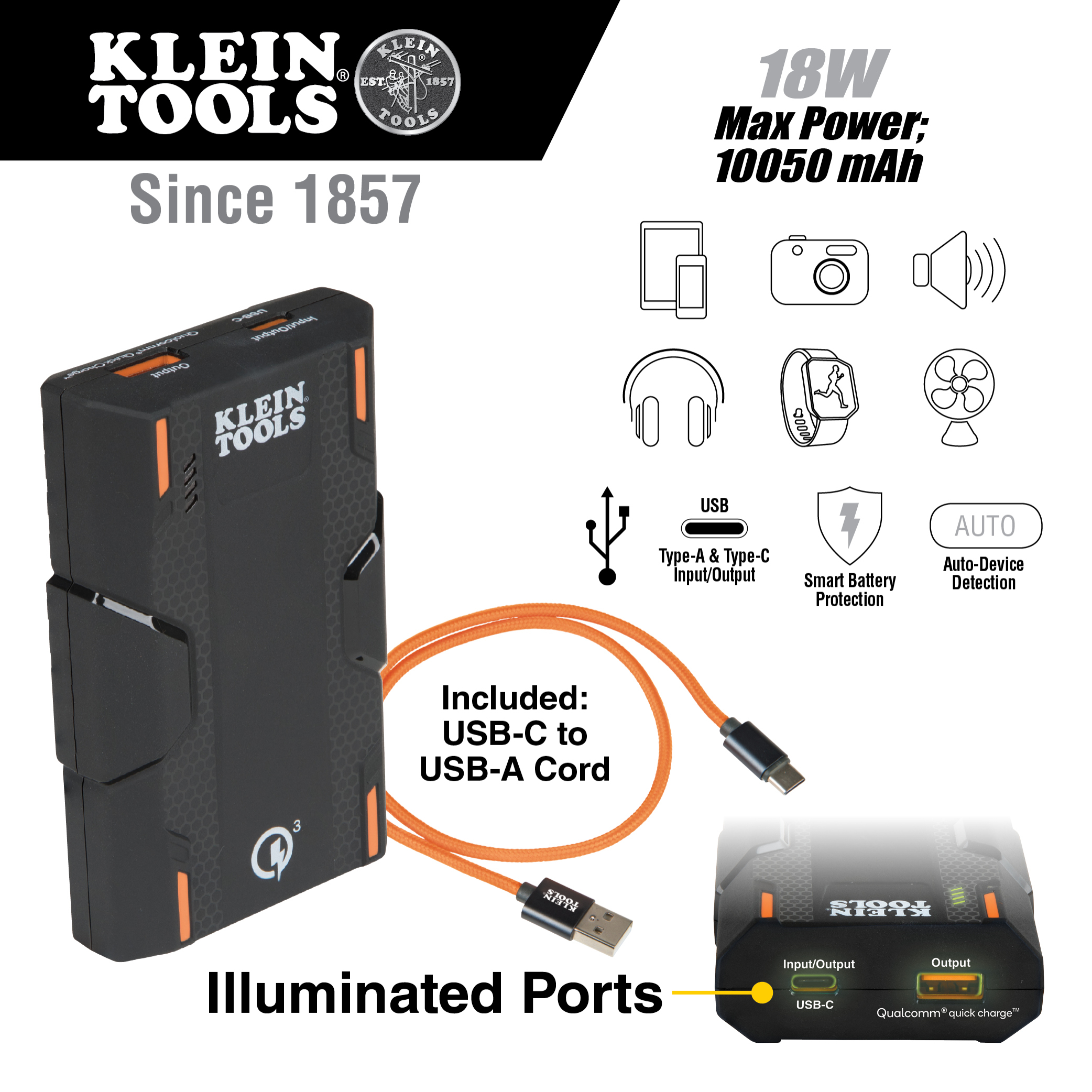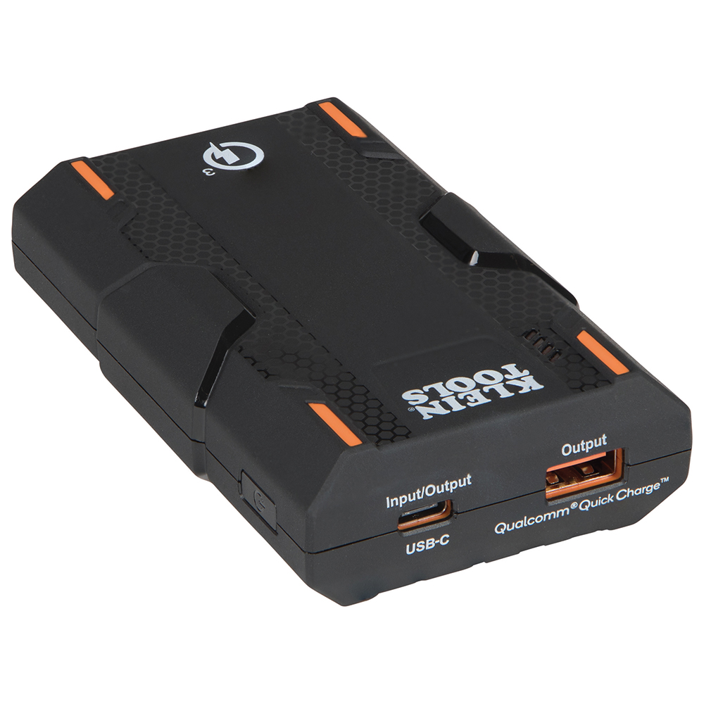 The Klein Tools KTB1 is a Lithium-ion powered portable battery (power bank) designed to charge common mobile devices like cell phones, tablets, portable batteries, headphones, headlamps and other smaller USB devices. KTB1 is equipped with Qualcomm® Quick Charge™ technology, delivering up to 75-Percent faster charging versus conventional USB charging. KTB1 features a rugged, compact design with impact resistant housing to stand up to active, professional daily use.