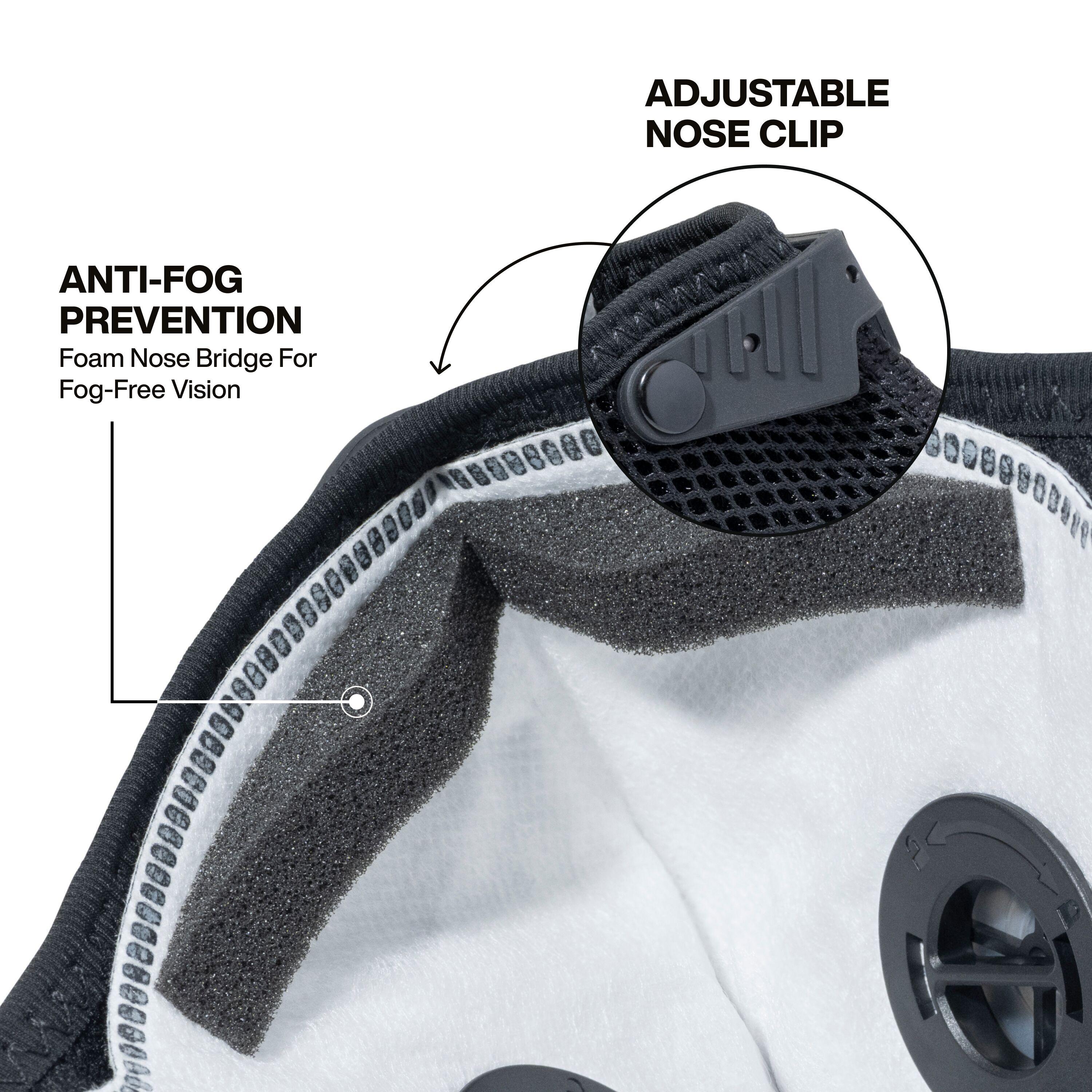 Fog Prevention; Hook and Loop Adjustable Straps; Adjustable Nose Bridge