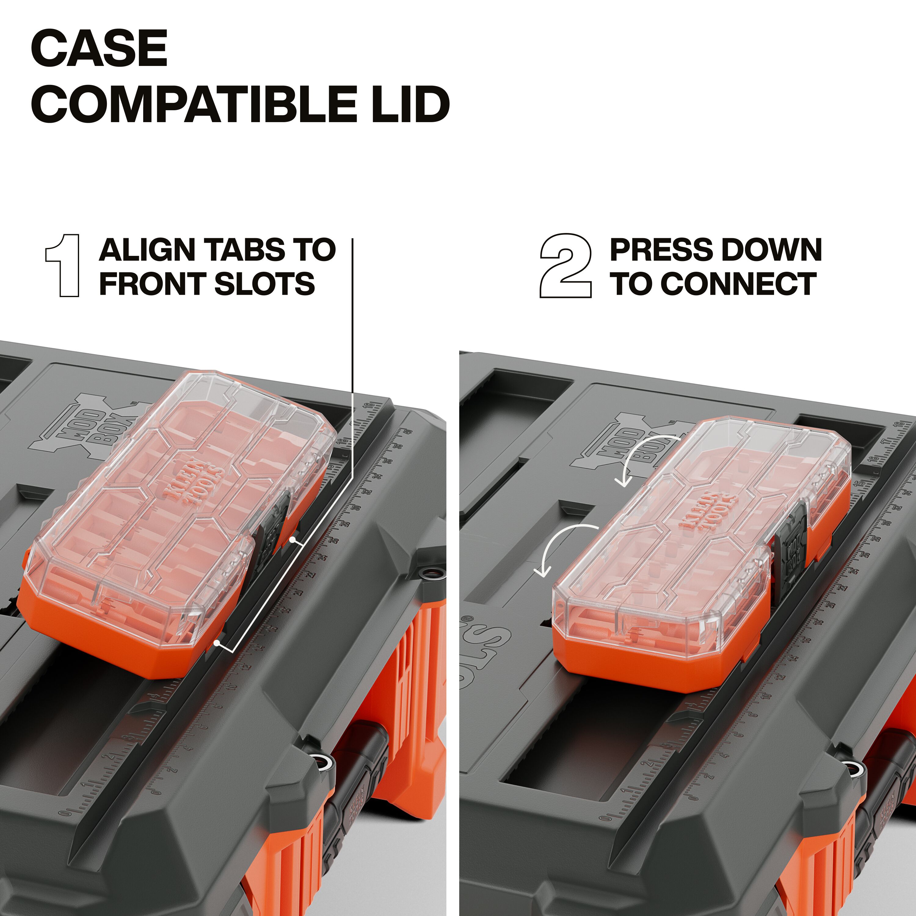 The Klein Tools MODbox™ Rolling Toolbox delivers rugged mobility with a 250-Pound load rating, 10-Inch solid rubber wheels, and a removable telescoping handle built for tough terrain. A case-compatible lid with V-groove and ruler adds on-site utility, while IP65 sealing protects tools from dust and water. Connects seamlessly for a customized mobile workstation.
