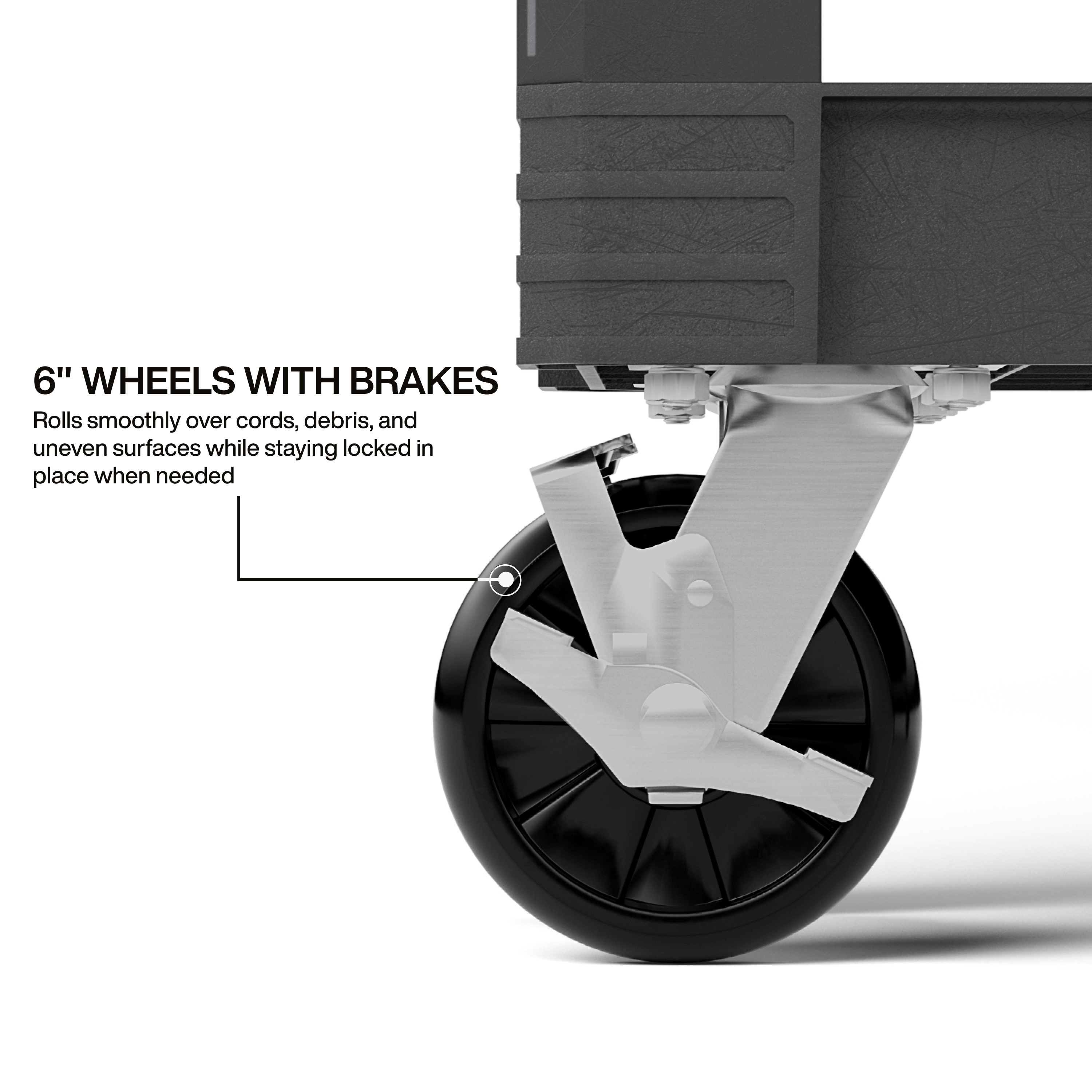 The MODbox™ Service Utility Cart transports up to 500 pounds on jobsites with professional-grade mobility. This heavy duty tool cart features 36-Inch height to provide a comfortable work surface, 6-Inch wheels for rough terrain, and MODbox™ rail system for accessories. Utility cart also includes handle storage, holes in legs to fit 1/2-Inch conduit pipe, and top shelf notches for cutting support.