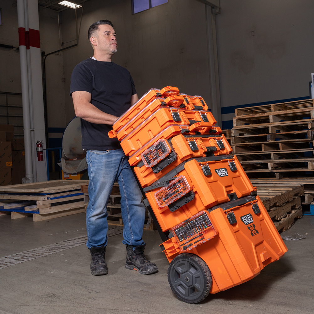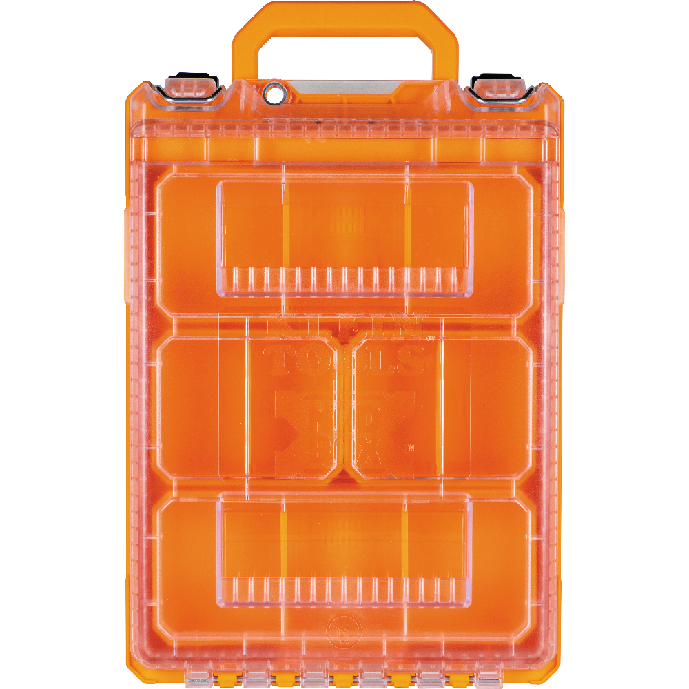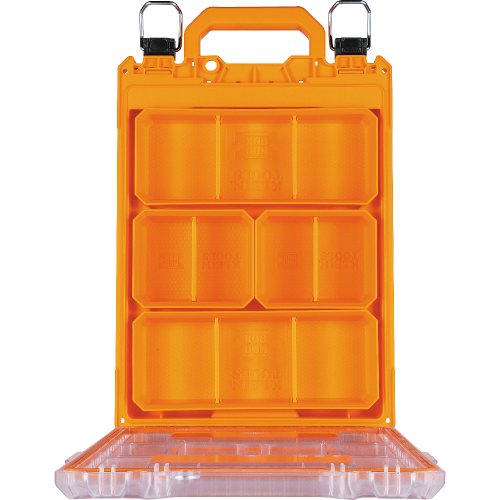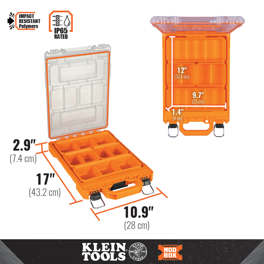 Klein Tools MODbox™ Short Component Box, Half Width comes with 4 removable storage bins and a stay-put lid design to keep contents from shifting. The clear lid provides an easy view of contents such as wire nuts and fasteners. Component box is IP65 rated and made with impact resistant polymers. Easily connects with other MODbox™ components to make a custom mobile workstation.