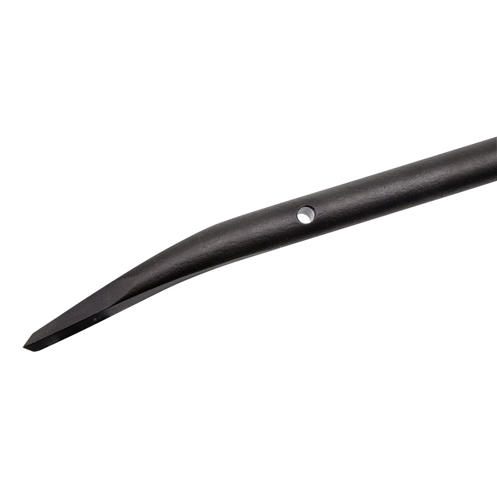 This chisel-end of this round connecting bar is at a 15-degree angle to give greater leverage when positioning steel members and aligning bolt holes. Made of hardened steel for durability and long life. The angled chisel end provides greater leverage. Features a cross hole for tethering when working at height.