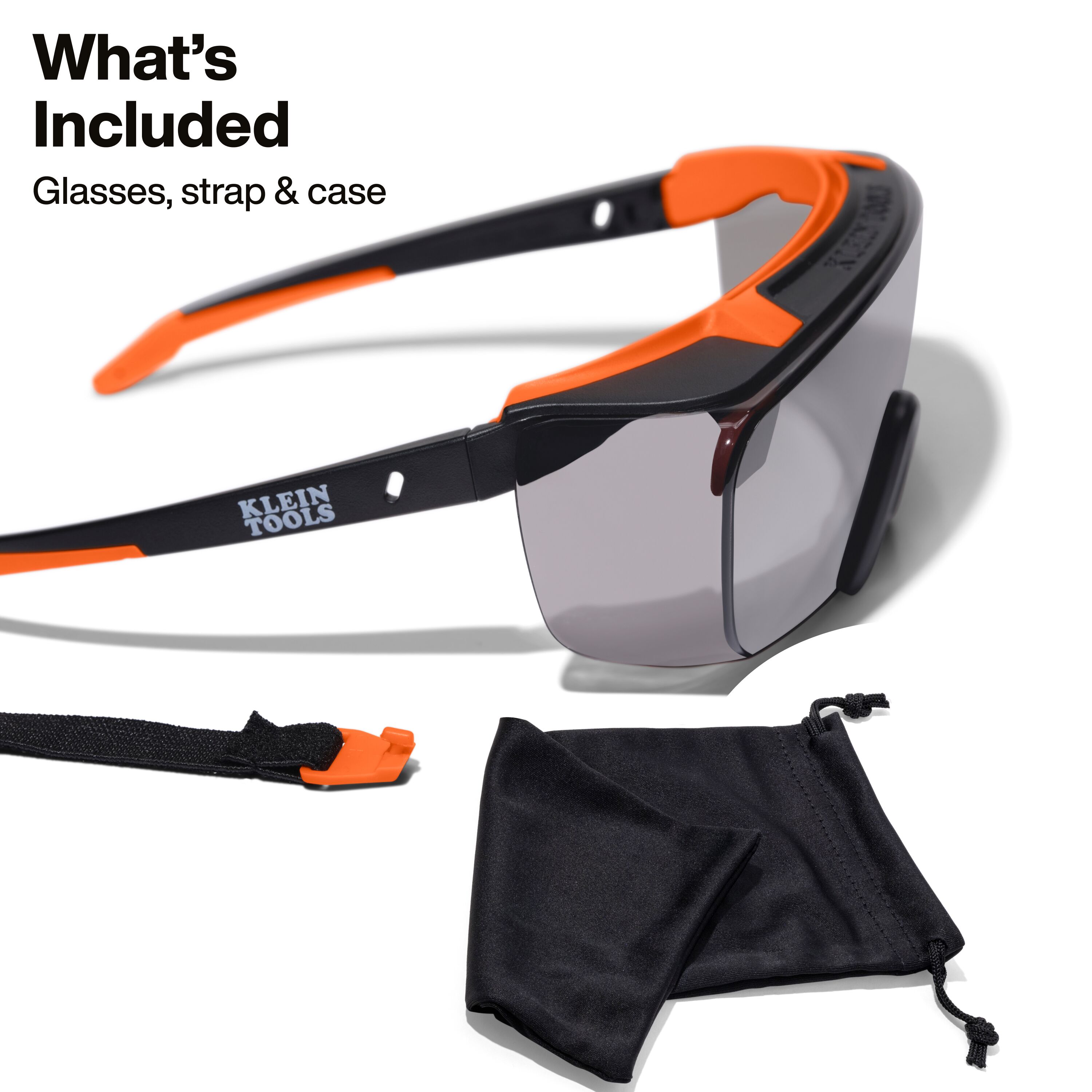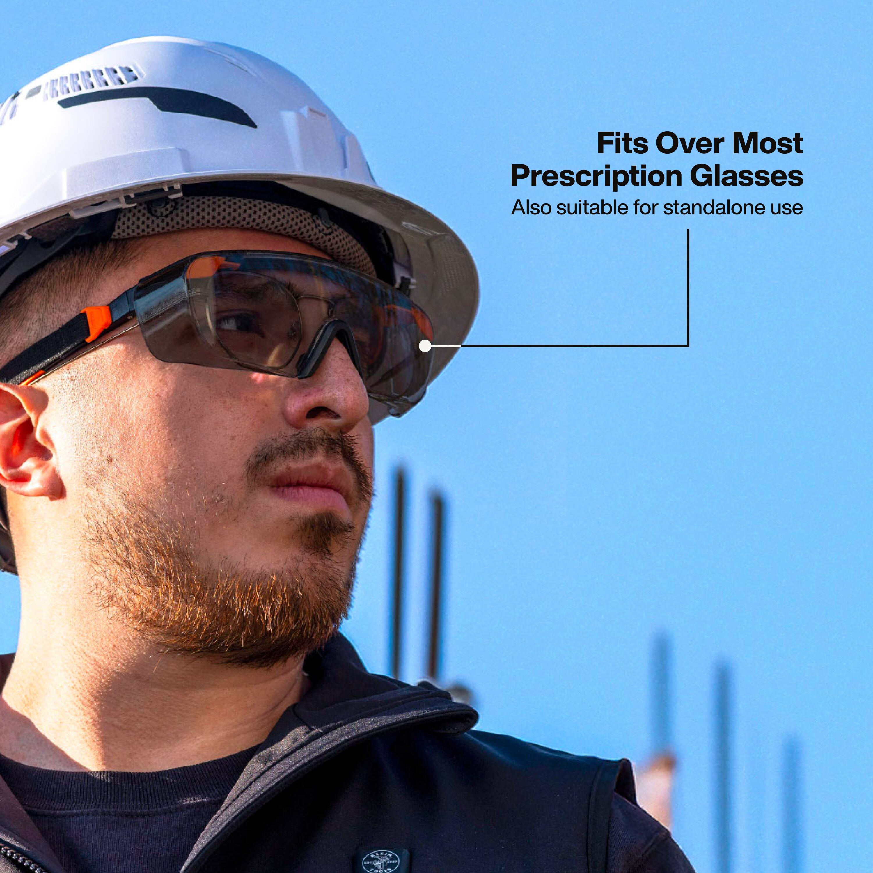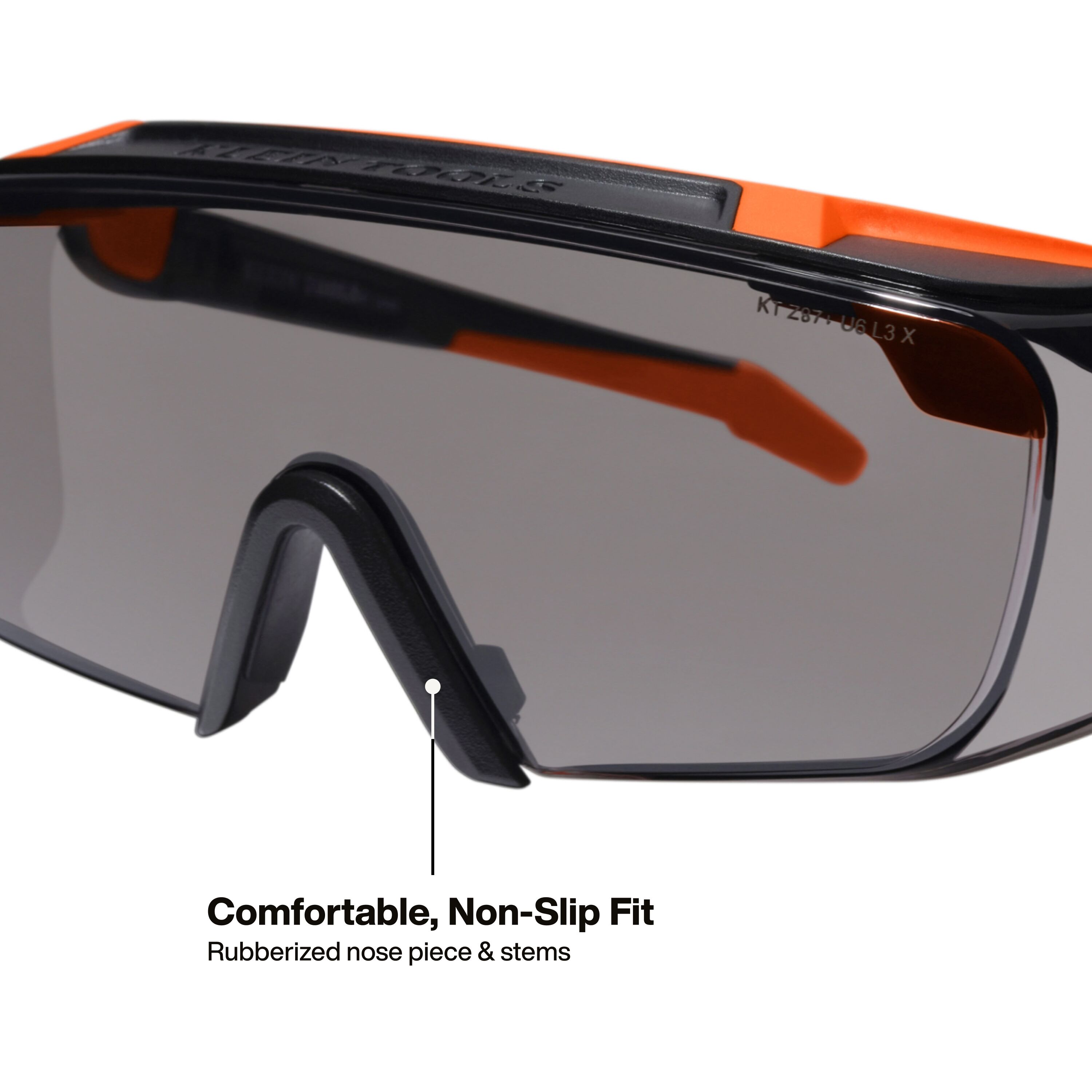 Klein Tools Over-The-Glasses Safety Glasses Shaded Lens deliver premium protection for prescription eyewear users working outdoors. High-impact rated and UV-blocking, these glasses feature anti-fog, scratch-resistant lenses for all-day clarity. A rubberized nose piece and stems ensure a secure, comfortable fit, while the OTG design fits easily over most glasses.