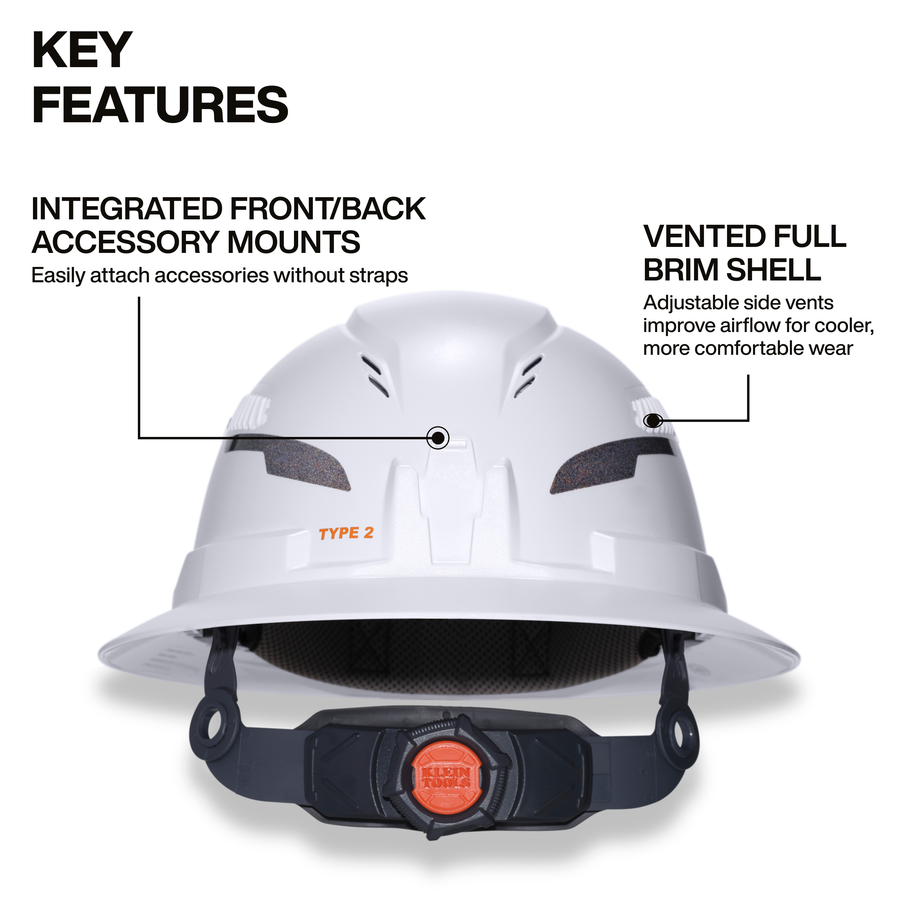 Klein Tools Cat. No. 60407T2RL Type 2 Hard Hat delivers advanced protection, comfort, and visibility for professionals working in hot, high-risk environments. Patented accessory mounts allow secure, strap-free headlamp attachment; paired with an included 300-Lumen rechargeable headlamp for all-day runtime. The 6-Point suspension system ensures a comfortable, breathable fit, while washable padding and a vented full brim shell enhance airflow for cooler wear.