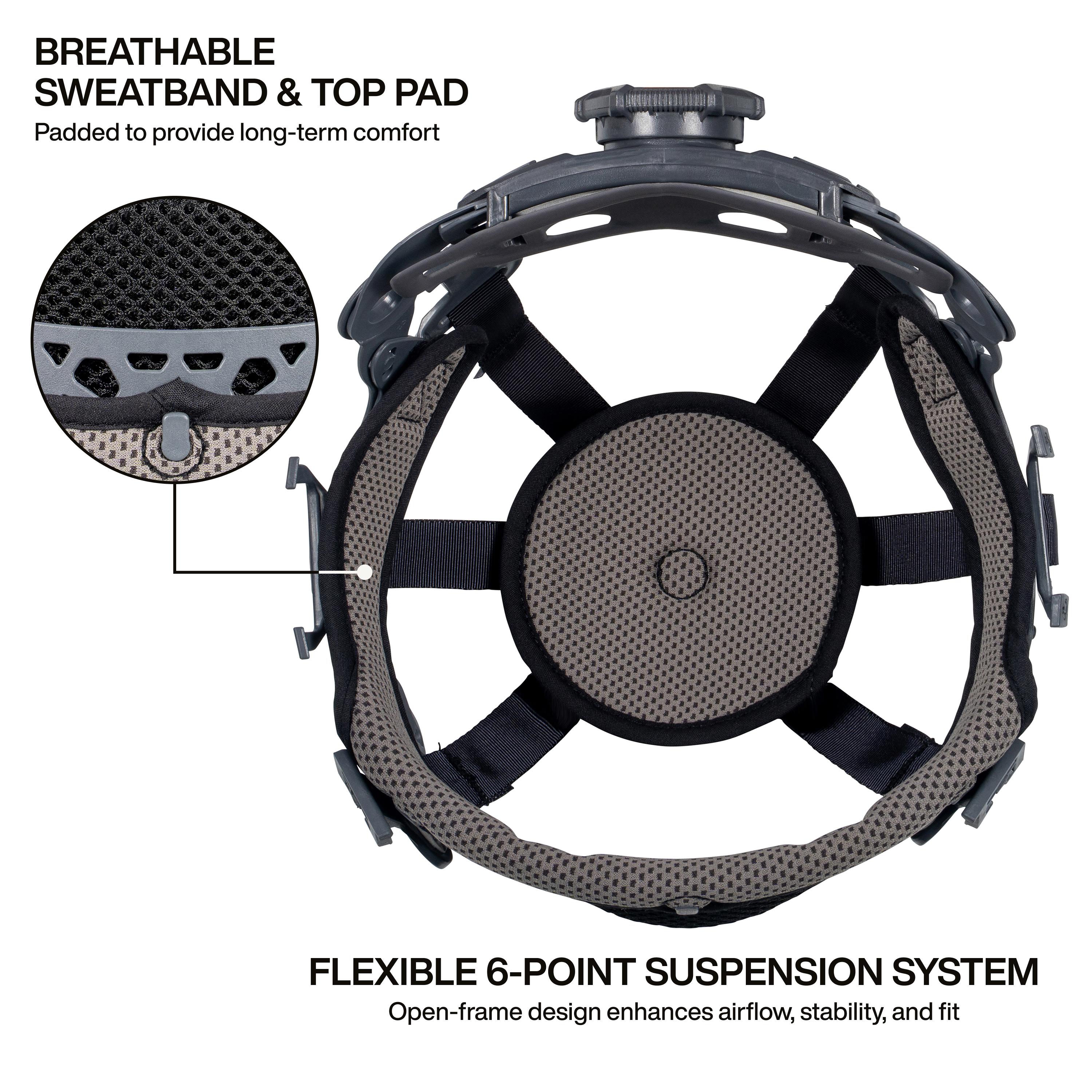 - 6-Point suspension improves fit and airflow while providing full coverage around the head
