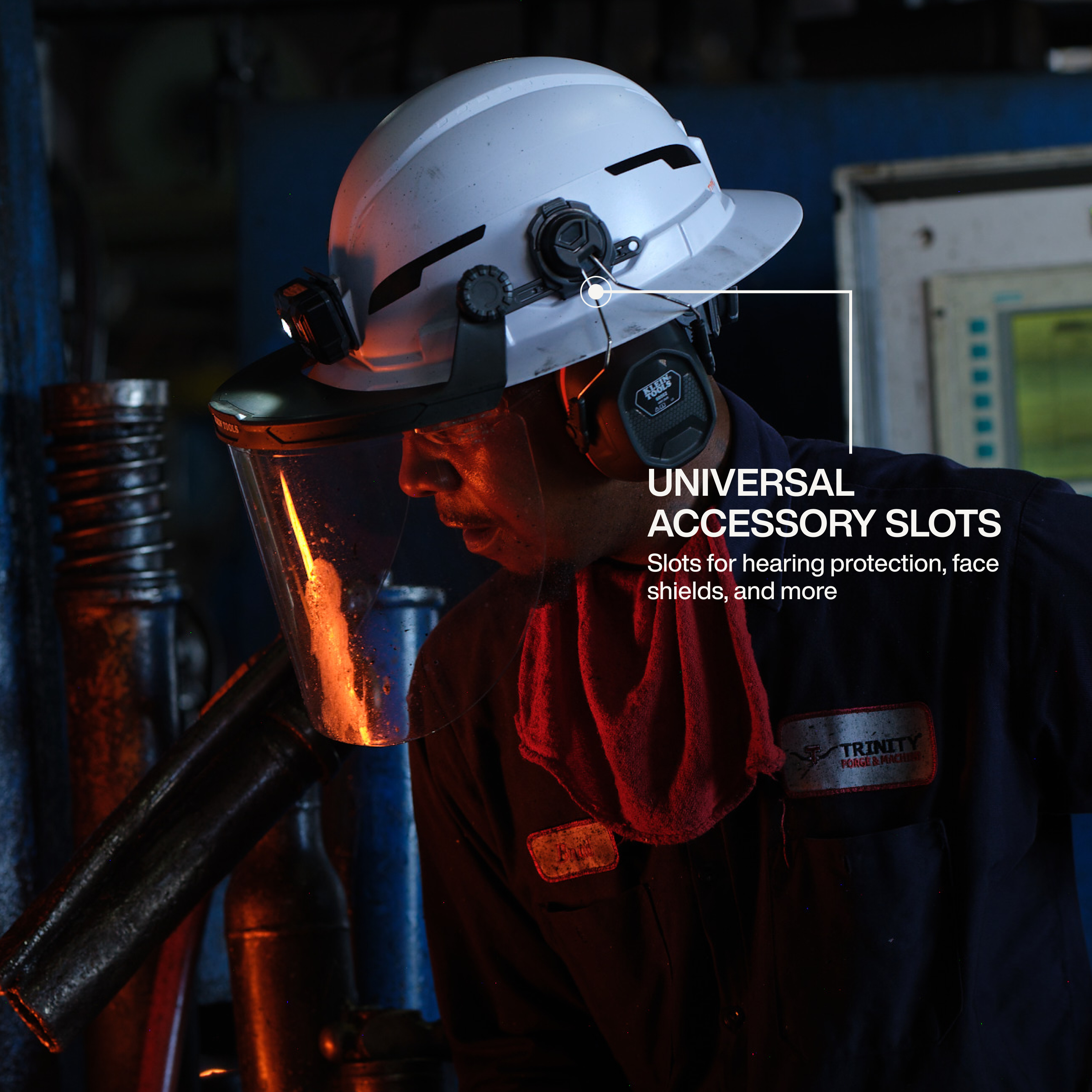 Klein Tools Cat. No. 60400T2 Type 2 Hard Hat delivers advanced protection, comfort, and visibility for demanding jobsite conditions. Patented accessory mounts allow secure, strap-free headlamp attachment. The 6-Point suspension system ensures a comfortable, breathable fit, while washable padding and a non-vented full brim shell provide reliable performance in high-risk environments.