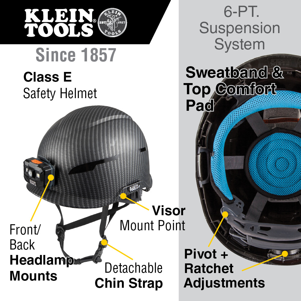 Klein Tools Premium KARBN™ Safety Helmets are engineered for optimal safety, comfort and fit. Compact helmet design and unique features allow the user to comfortably work in confined spaces and a variety of demanding environments. Tested up to 20kV of electrical protection. Patent-pending accessory mounts on front and back ensure optional Klein Headlamps attach securely; no straps needed. Low profile design with accessory slots for optional face shields and Klein visors.