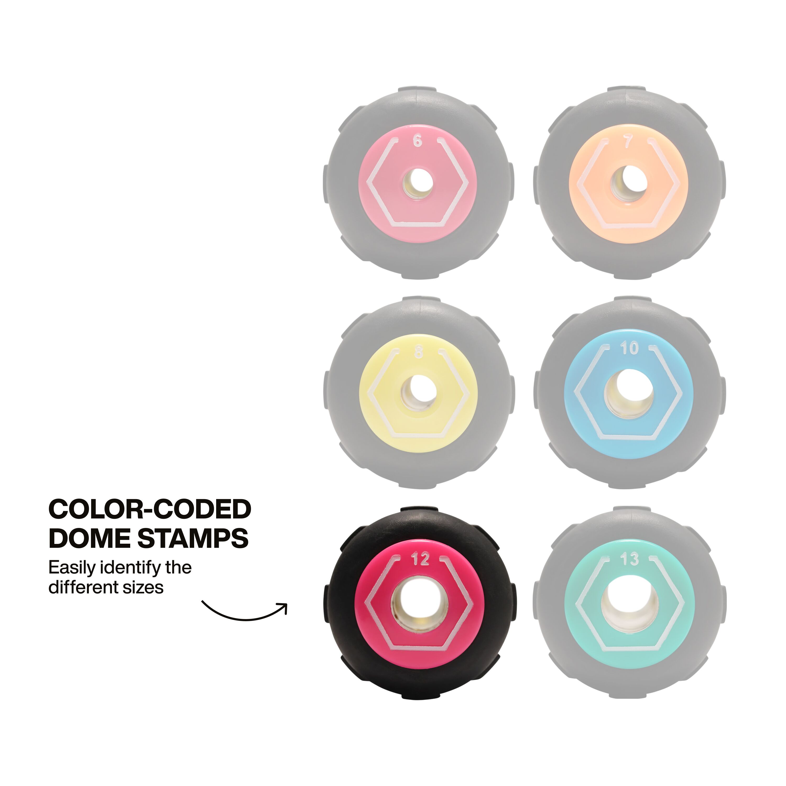 • Color-coded dome stamp for easy identification of different sizes
