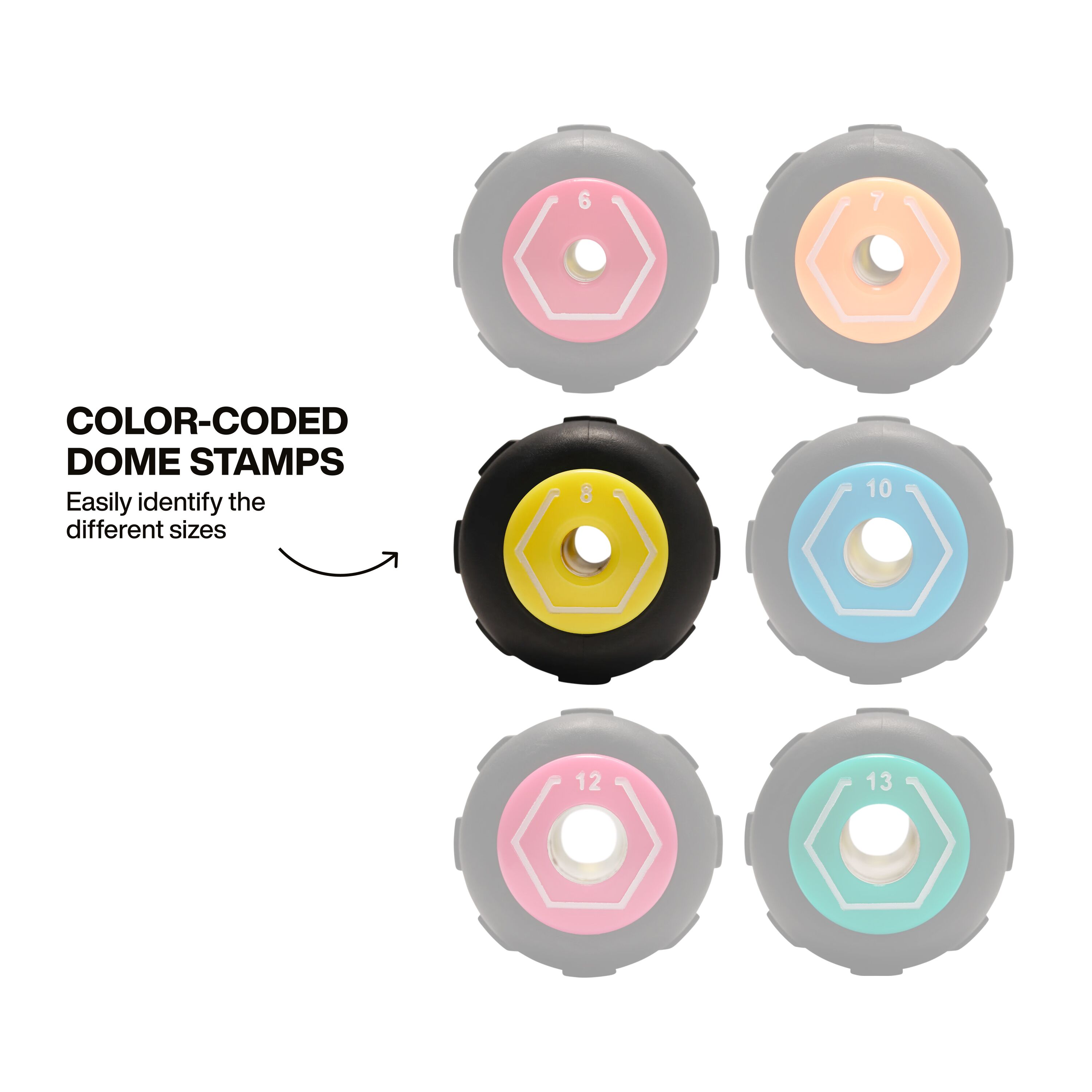 - Color-coded dome stamp for easy identification of different sizes
