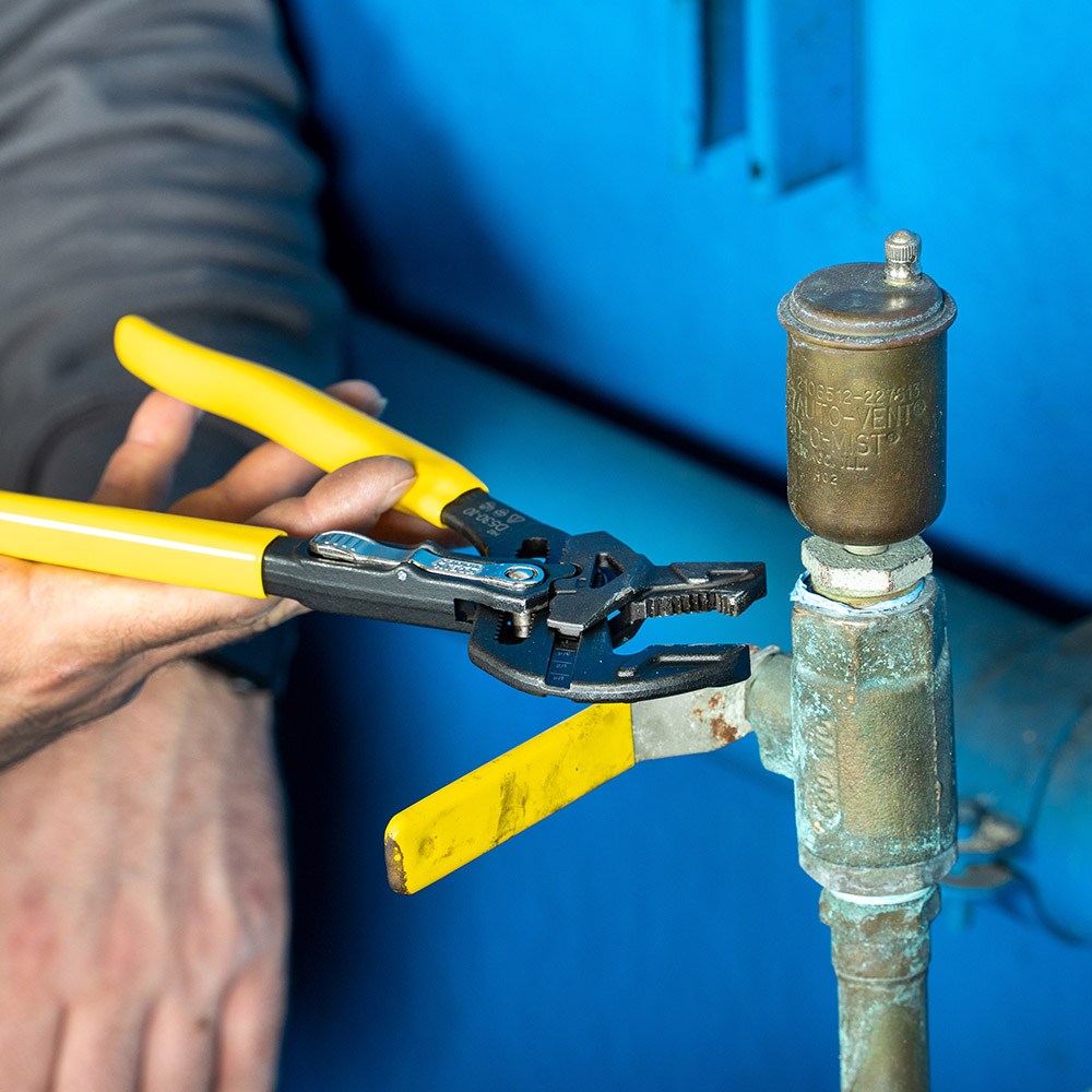Klein's 2-Piece Plier Wrench Set includes 7-Inch and 10-inch adjustable plier wrenches. Their reversible jaws provide smooth parallel surfaces on one side for use as a traditional plier wrenches, with the added versatility of knurled teeth on the reverse sides when extra bite is needed on pipe or other round objects. They also include unique and efficient push button adjustment.