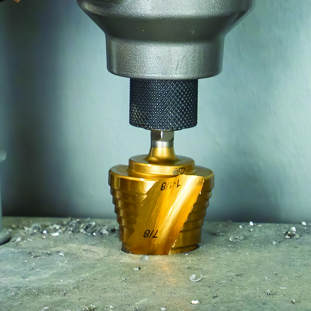 Dual Spiral Flutes on VACO Step Drill Bits help pull the step bit through material for faster cutting. The Titanium Nitride coating extends the life of the cutting edge. Convenient to use with an impact driver and drill, the 1/4-Inch hex shank provides a firm, positive grip. Available in five step bit sizes with commonly used hole sizes for steel (up to 16 gauge), plastic, aluminum, and wood.