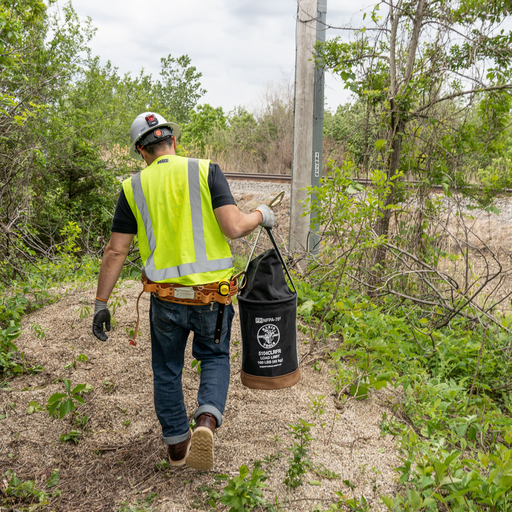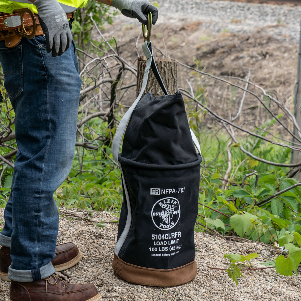 For added protection in the field, Klein's Flame-Resistant Top-Closing Tool Bucket is made of No. 4 canvas that meets the performance requirements of NFPA-701. The extended canvas top zips closed to keep tools inside during overhead lifting. Load rated for 100-pound (45 kg), it is stitched and riveted with a double-reinforced bottom for durability. It also features a locking carabiner for added safety.