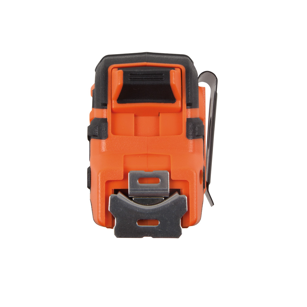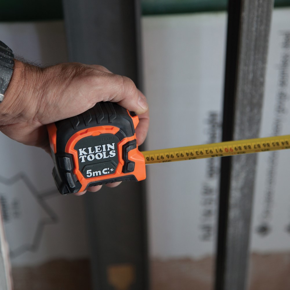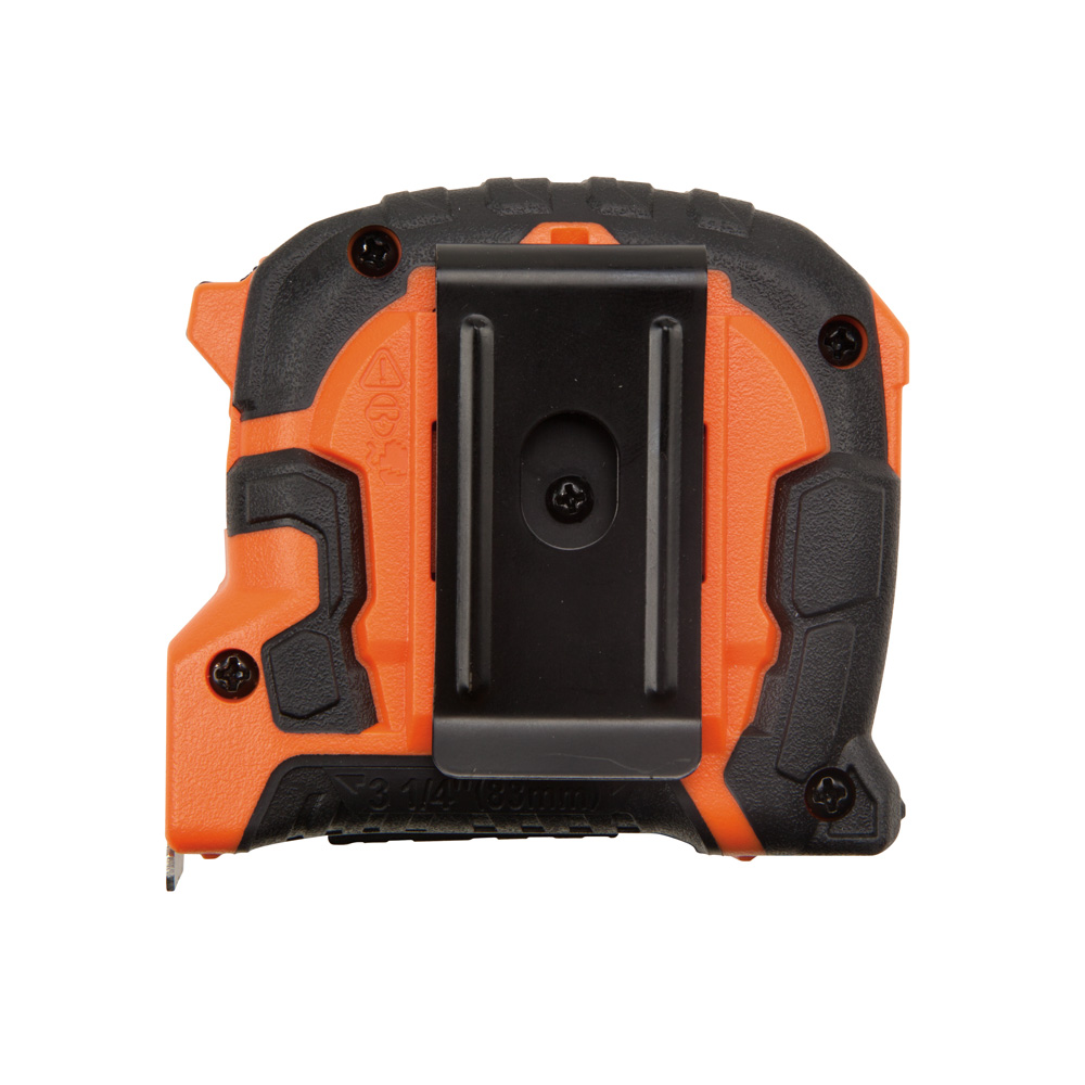 Klein Tools Tape Measures offer inventive first-rate features derived from jobsite professionals, to make jobs easier and more efficient. A magnetic double hook has a center top portion for hanging onto conduit right side up and upside down, while a 1-1/4 inch flared hook was designed specifically to pass through 1-3/8 inch holes drilled for 1 inch conduit. This large magnet profile attaches to steel and along EMT conduit. A sealed tape brake panel is large enough to allow 2-3 fingers to operate at once for safe retraction, and keeps water and dirt out to prevent tape blade rust and degradation. The high impact rugged rubberized industrial design offers a better grip and stands up to any task the jobsite demands.
