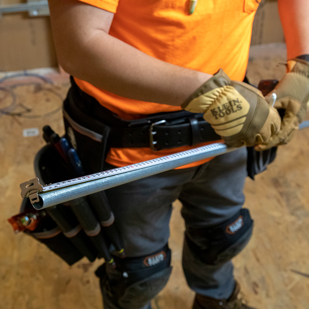 - Double hook can secure tape to items such as studs, conduit, pipes, etc. on front or back side of blade to measure with either measurement scale