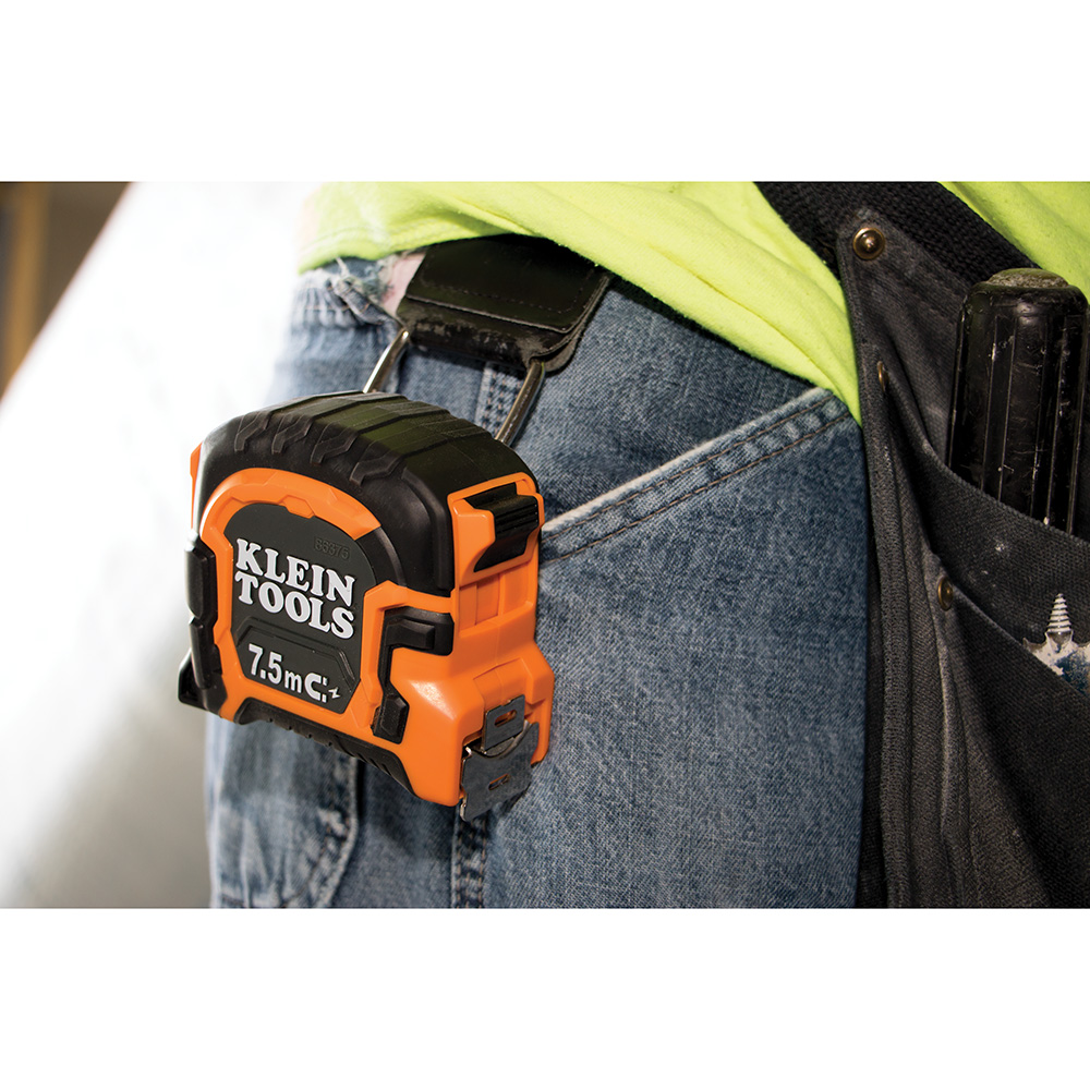 Klein Tools Tape Measures offer inventive first-rate features derived from jobsite professionals, to make jobs easier and more efficient. A magnetic double hook has a center top portion for hanging onto conduit right side up and upside down, while a 1-1/4 inch flared hook was designed specifically to pass through 1-3/8 inch holes drilled for 1 inch conduit. This large magnet profile attaches to steel and along EMT conduit. A sealed tape brake panel is large enough to allow 2-3 fingers to operate at once for safe retraction, and keeps water and dirt out to prevent tape blade rust and degradation. The high impact rugged rubberized industrial design offers a better grip and stands up to any task the jobsite demands.