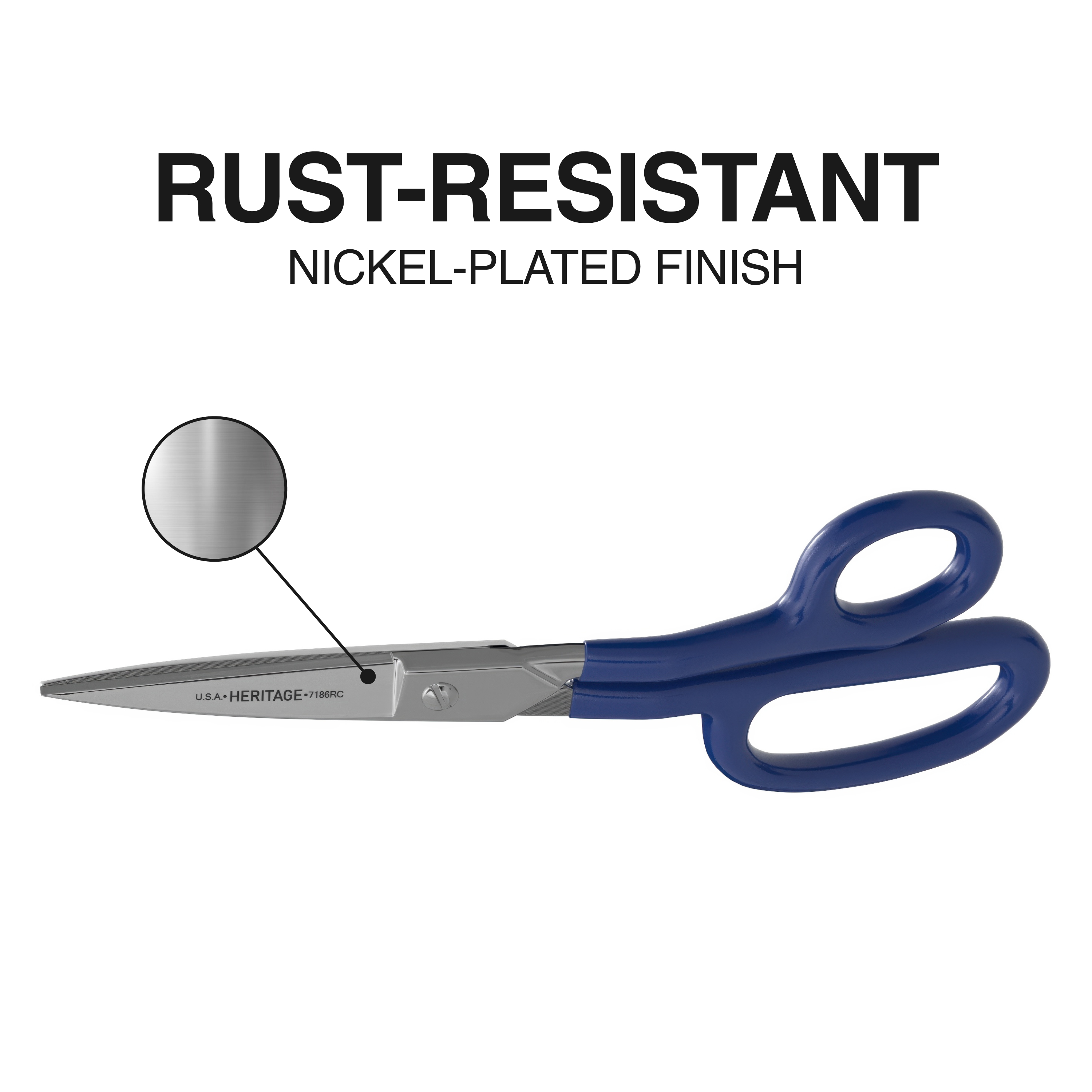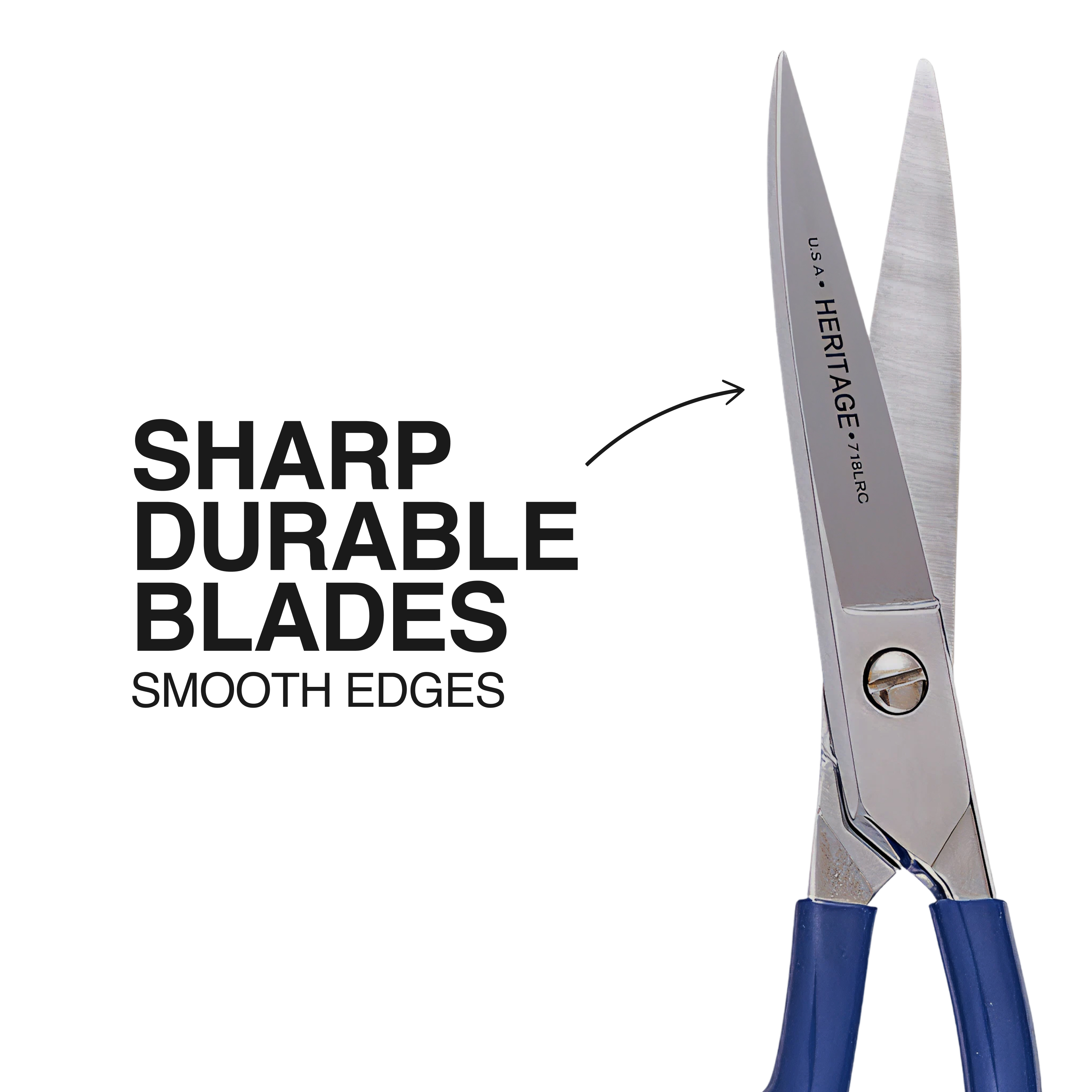 The Heritage Cutlery, by Klein Tools, G718LRC Heavy-Duty Carpet Shear is crafted from hot-forged steel with offset, curved handles, offering durability for carpet installation projects. These shears are also perfect for cutting thick fabrics, upholstery, rugs, and more, while reducing hand fatigue. Snips are suitable for proffesional and DIY tasks. Made with quality materials in the USA.