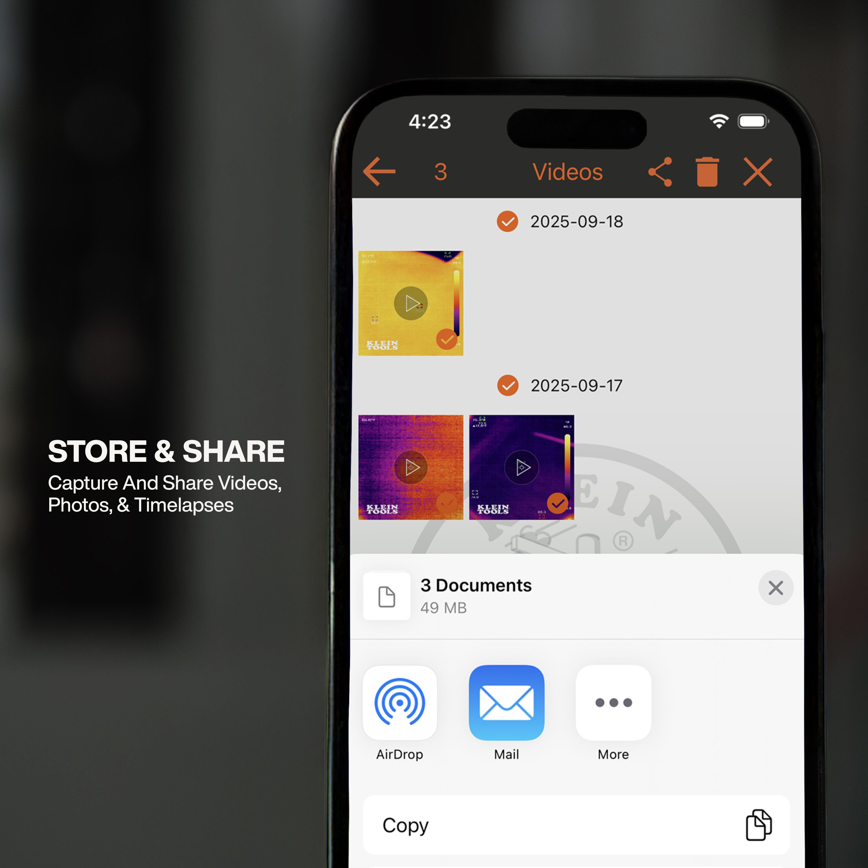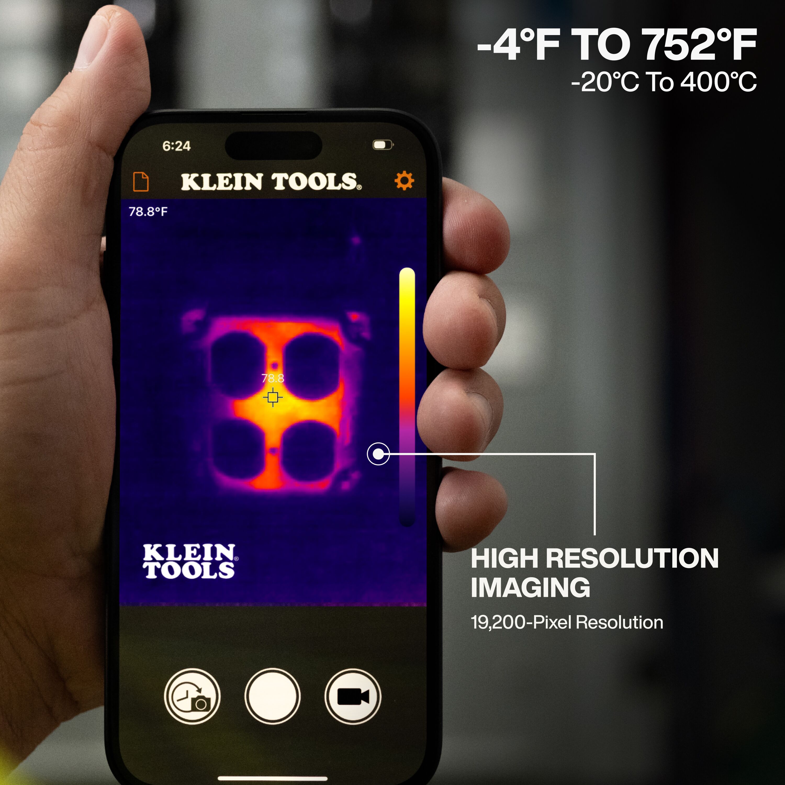 Klein Tools Mobile Thermal Imager transforms smartphones into professional thermal imaging cameras with 19,200-pixel resolution. This compact thermal imager is designed to capture hot and cold spots from -4 to 752-Degree Fahrenheit in three color palettes. Features touch screen temperature modes including spot, high/low, and differential readout. Time-lapse video capability enables comprehensive documentation, and it fits phone cases up to 1/5-Inch with iOS® and Android® compatibility.