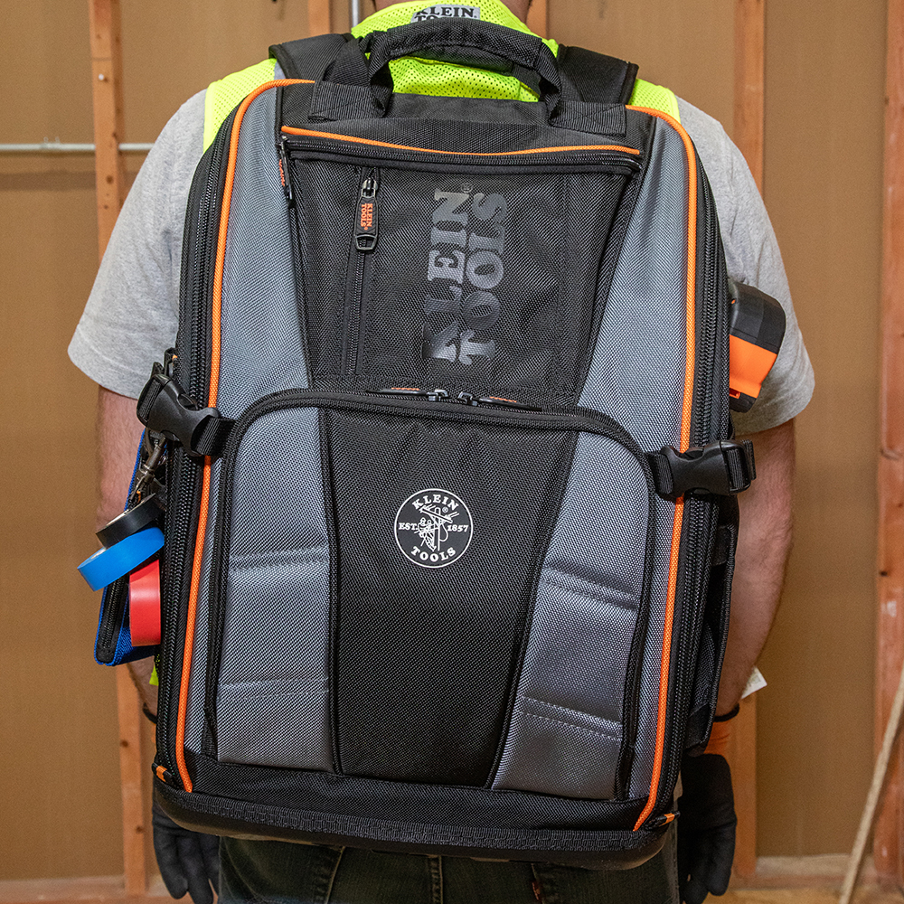 The Tradesman Pro™ Tool Station Pro Backpack has 27 pockets and a large interior for maximum tool storage. The front flap unzips halfway for quick tool access or fully extends for workstation access. The tough, wide molded bottom protects from the elements and keeps the bag from tipping. It also includes an internal bracket for use with a Klein Tools Headlamp to illuminate tool bag interior or external surroundings.