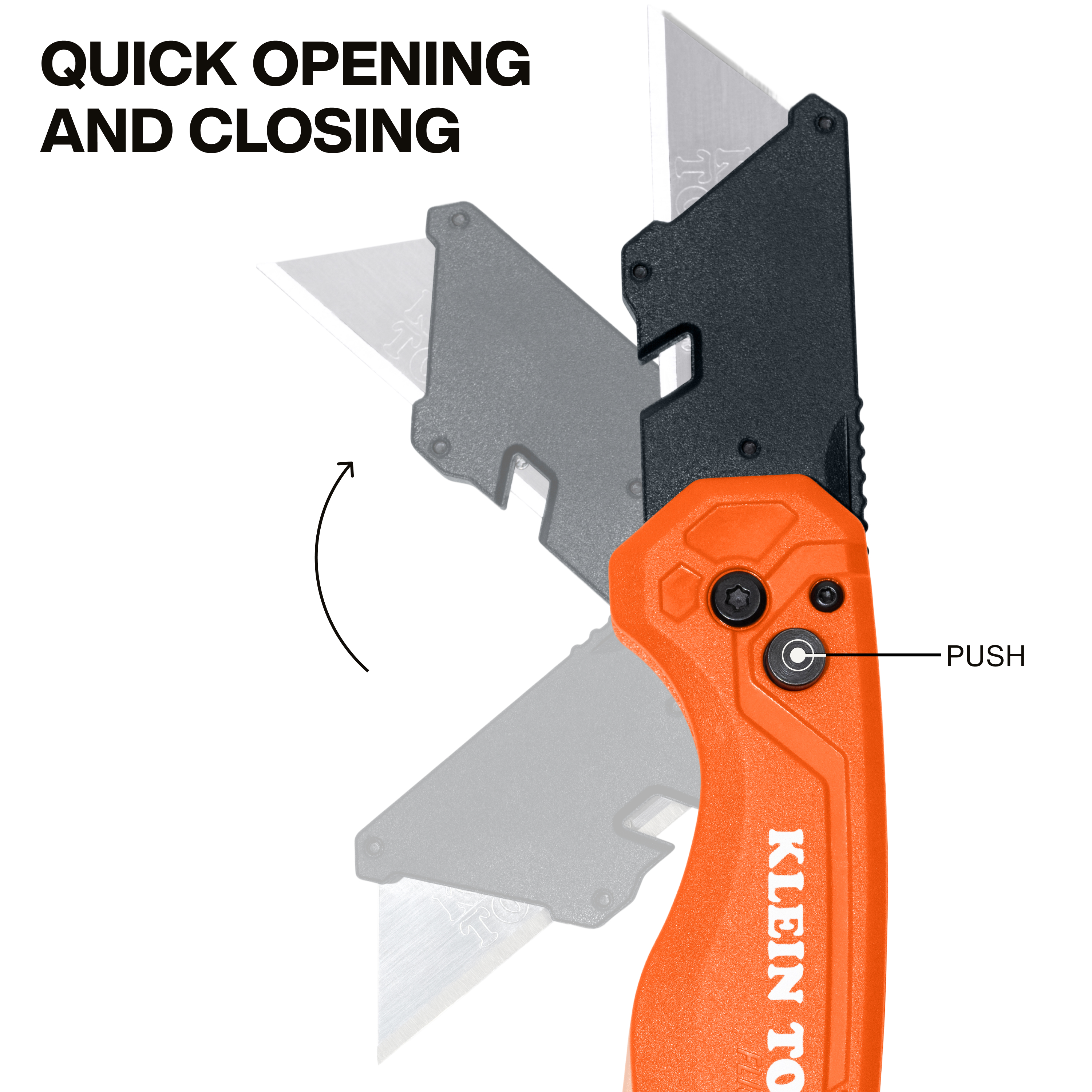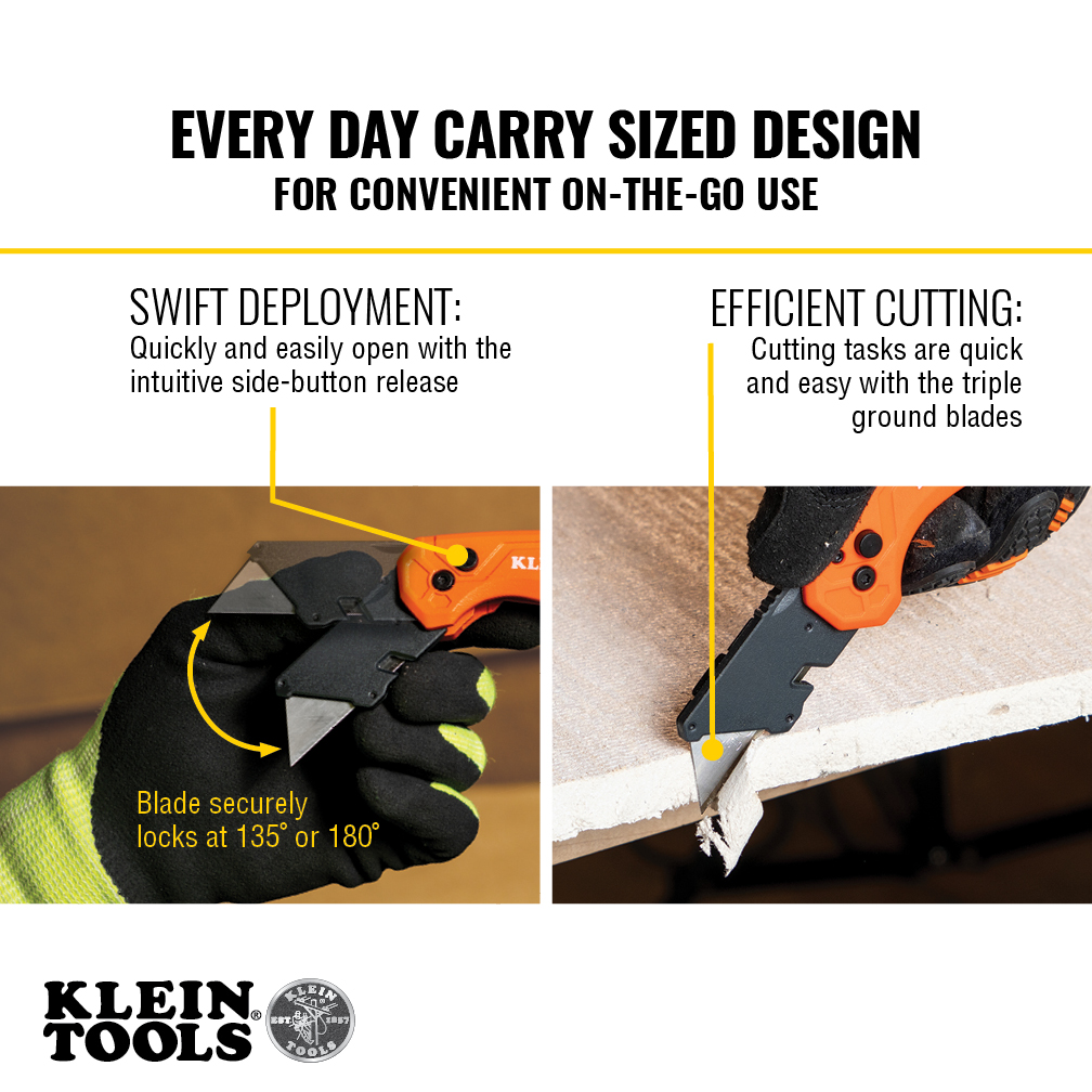 Klein Tools' Folding Utility Knife is engineered for both comfortable use and seamless carry and storage. While folded it effortlessly slips into a tool pouch while offering pocket portability with a handy belt clip. Its intuitive side-button release allows for swift deployment, flicking open smoothly for use in either 135-Degree or 180-Degree orientations, ensuring effortless cutting for every task.