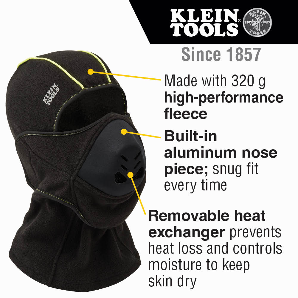 The Heat Exchanger Balaclava is made with high-performance 320 g fleece and it's designed to be worn with safety goggles. The technology of the heat exchanger captures heat from each exhaled breath and brings the heat back to the body's core, helping to prevent loss of body heat. Winter Gear from Klein Tools provides ultimate warmth options so you can focus on getting the job done.