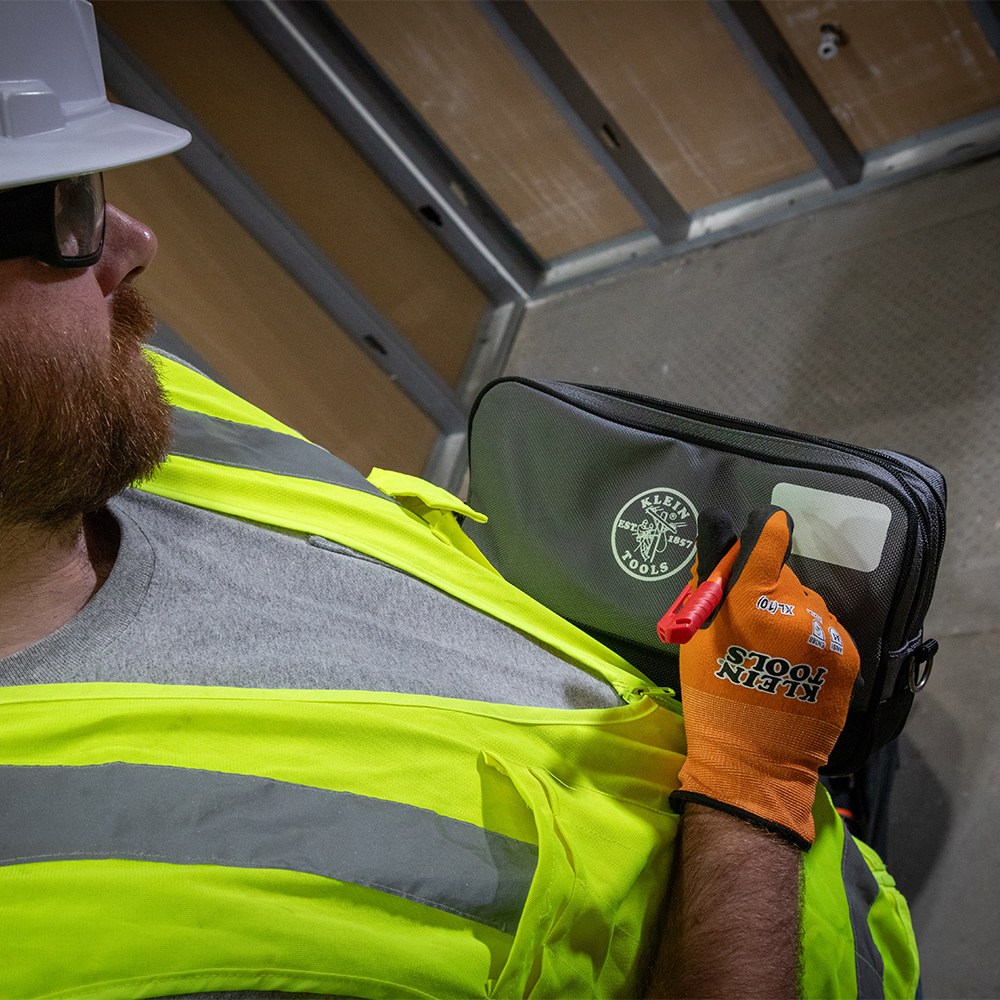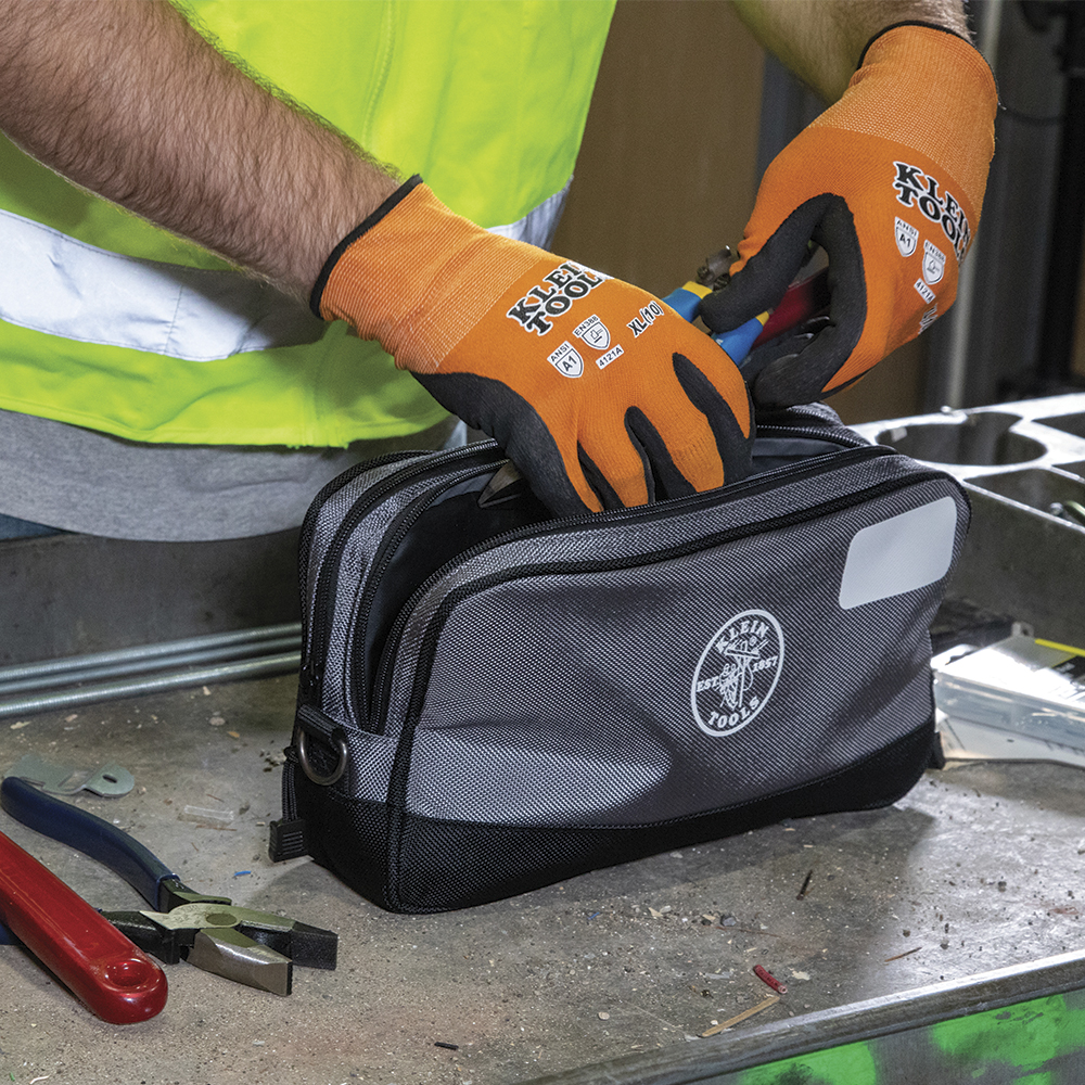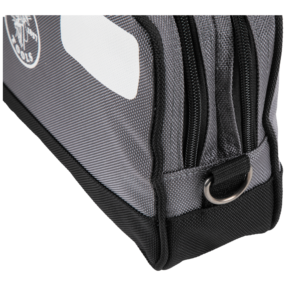 Easily access and organize tools and small parts with the Klein Tools Double-Zipper Tool Bag. This heavy-duty, water-resistant bag features two compartments with a reinforced bottom. Bag measures 12-Inch x 7-Inch (30.5 x 17.8 cm), with a 3-Inch flat bottom that keeps the bag upright for easy access. It has D-Rings on both ends to attached carabiners or shoulder strap and white space on front to write contents or name.